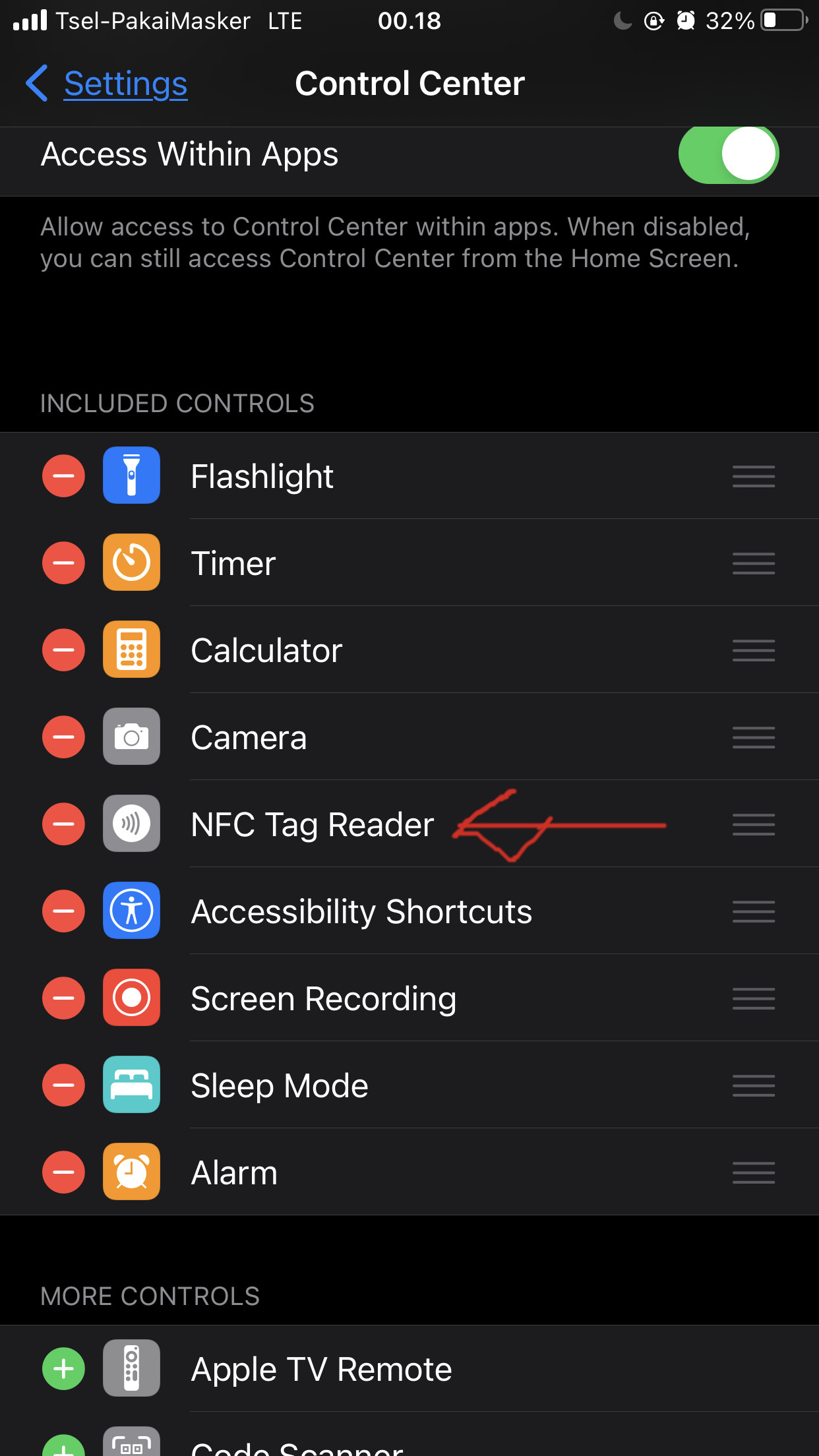 And the option for NFC Tag reader is right there and can be turned on and off from Control Center.