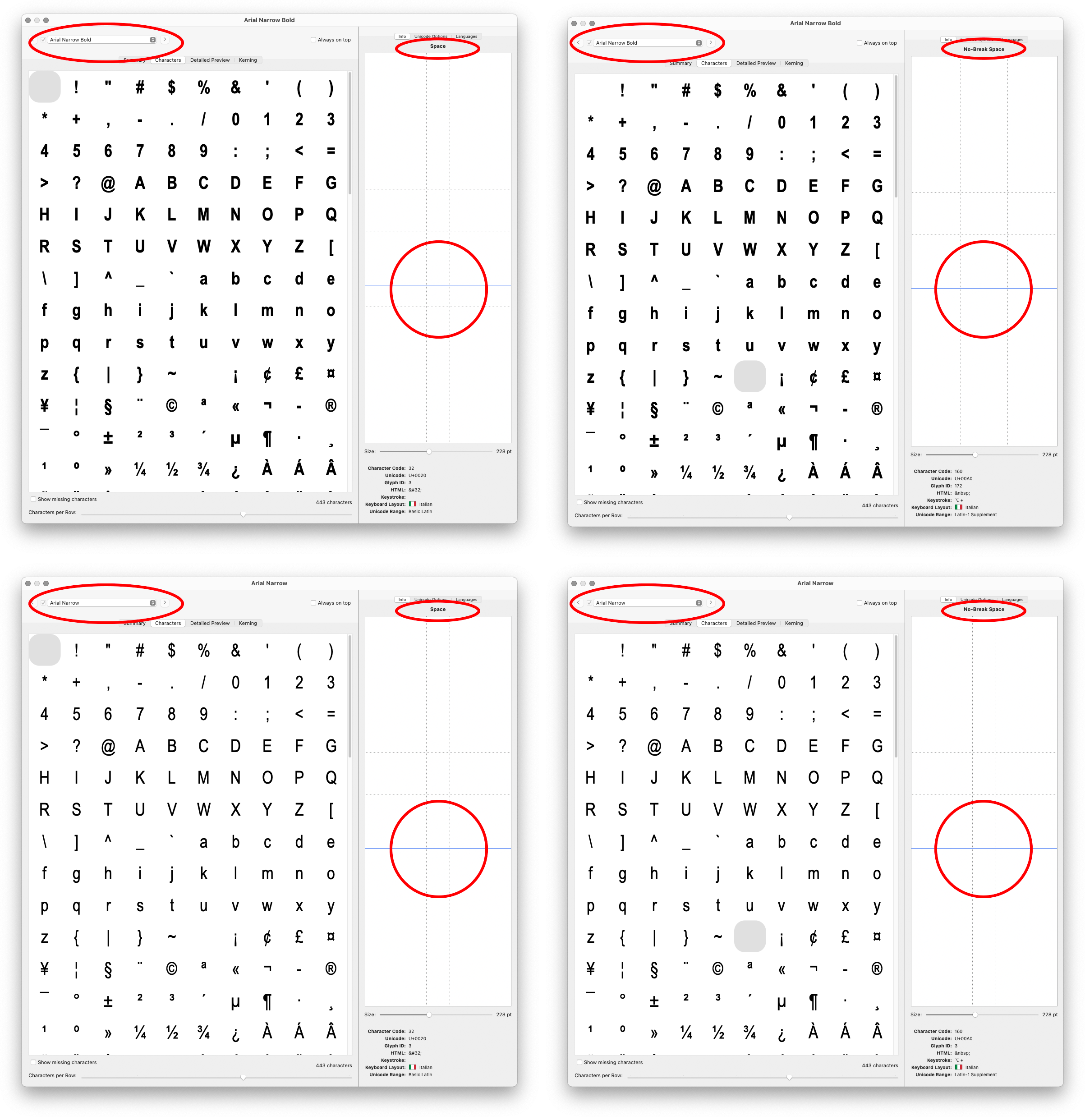 When I write something in Arial Narrow Bold, protected spaces get more spacing than in other weights of the same font family. I can reproduce this in Pages and TextEdit. Attached a screenshot (everything is Arial Narrow. First two lines Standard, last two line Bold).