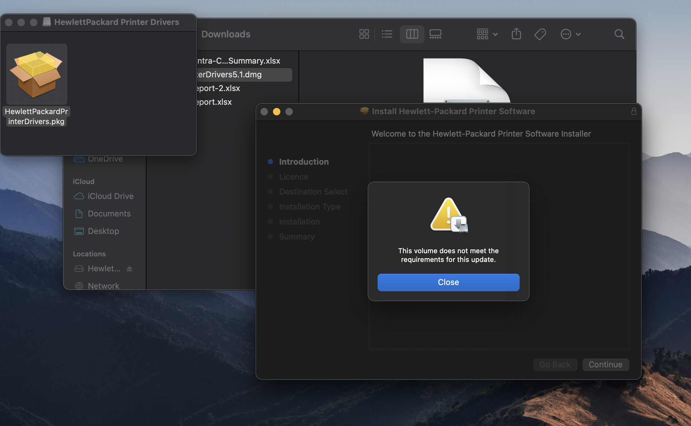 I am using MacBook Air 2020, I tried to install HP M1005 Laser Jet Multifunction printer software. It is not allowing to install. Its shows error "This volume does not meet the requirements for this update'. Can you please provide me the solution to install the printer.