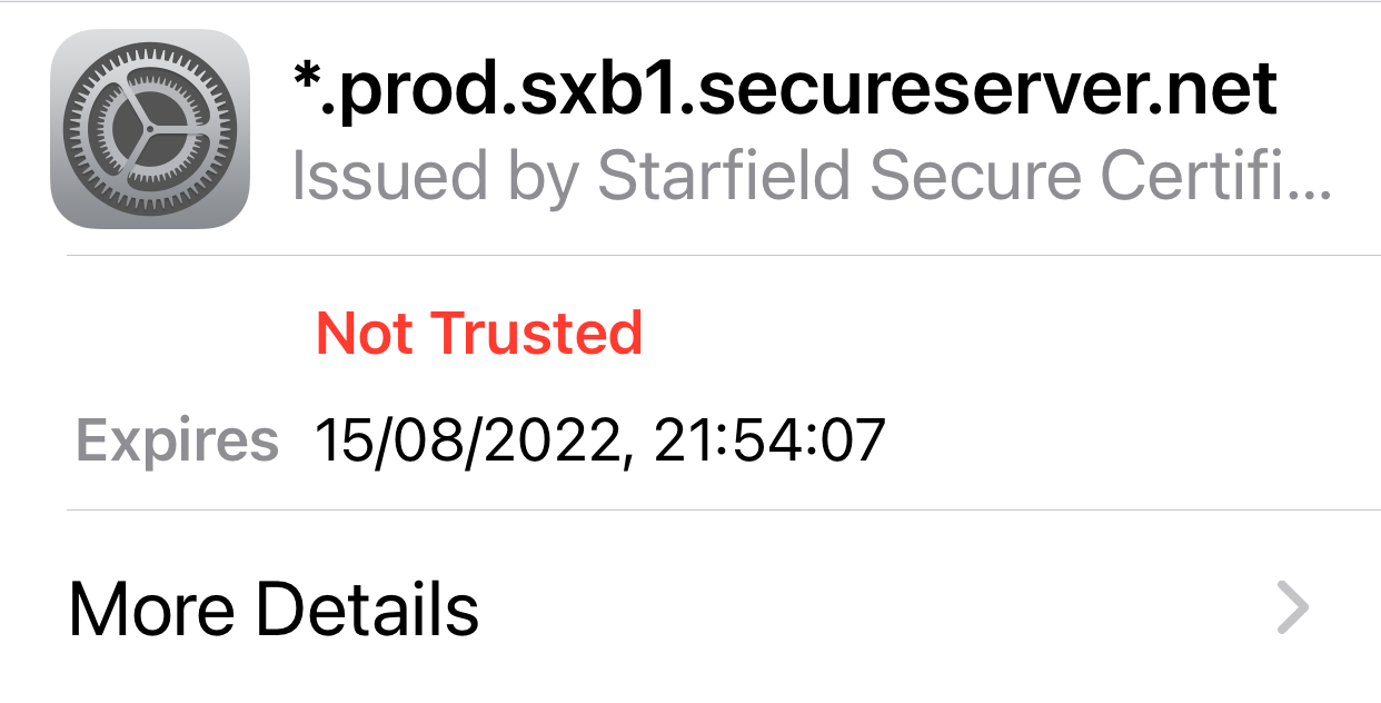 We're using the Starfield Root Certificate Authority - G2 SSL certificate and it appears not to be trusted since iOS 14.6 - neither in the app (API calls get rejected) nor in Safari. Does anyone know what happened? I can see this root certificate is still on the list of trusted certificates by Apple and it works on earlier iOS versions.