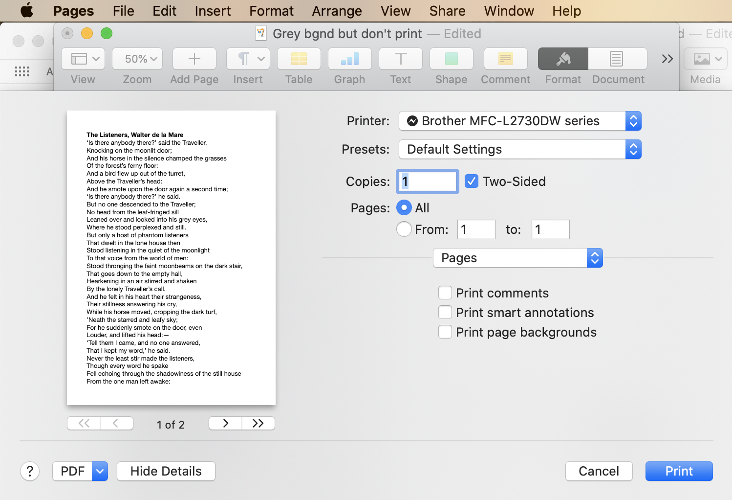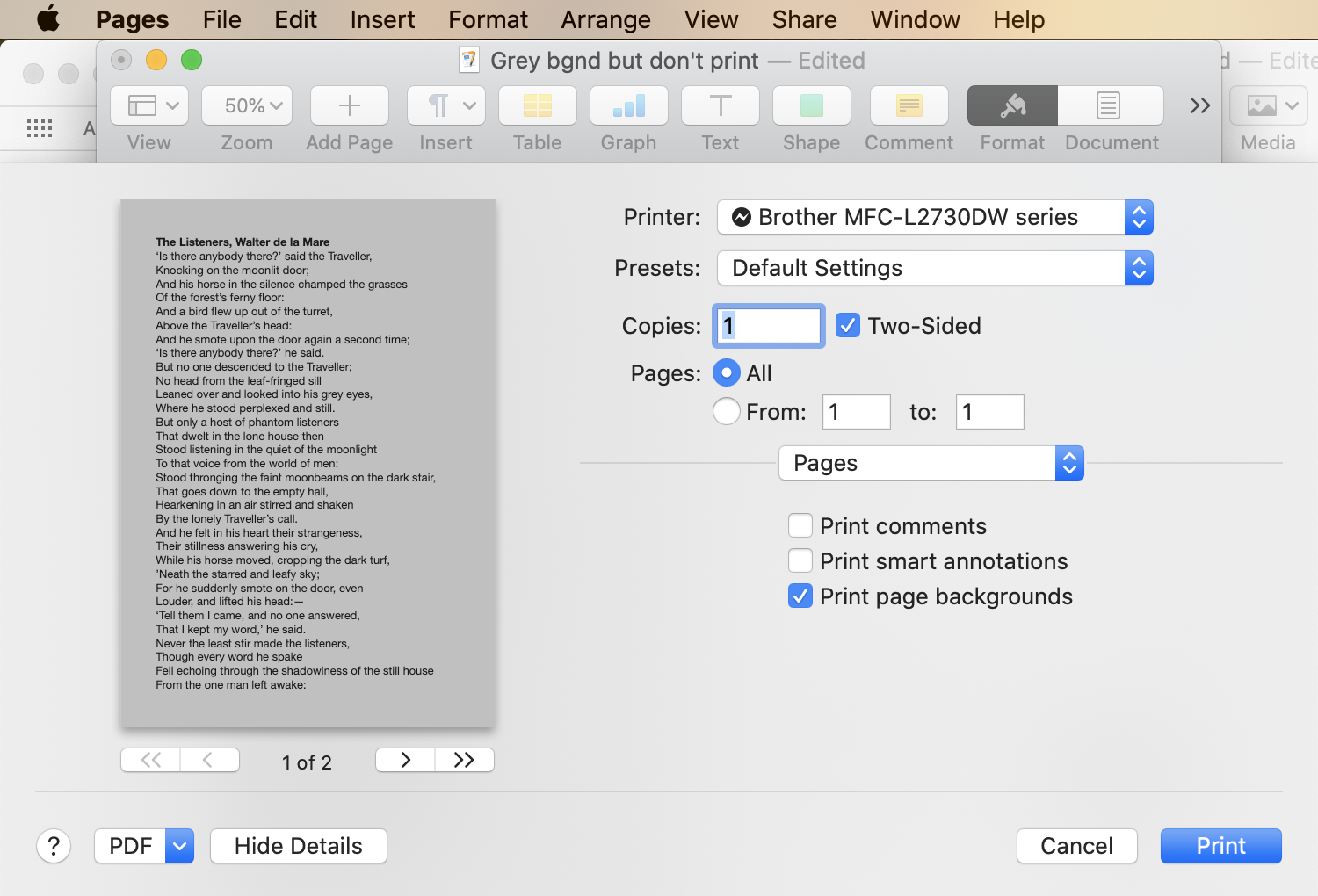 Untick Print page backgrounds (if your print dialogue has that option). The document will print black text on a white background.