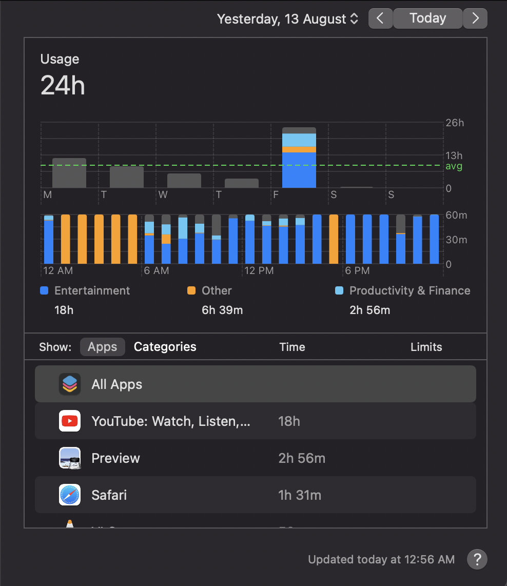 I apparently got 24hrs on screen time on my MacBook Air, it even said I've passed my app limits even when I haven't even watched YouTube.