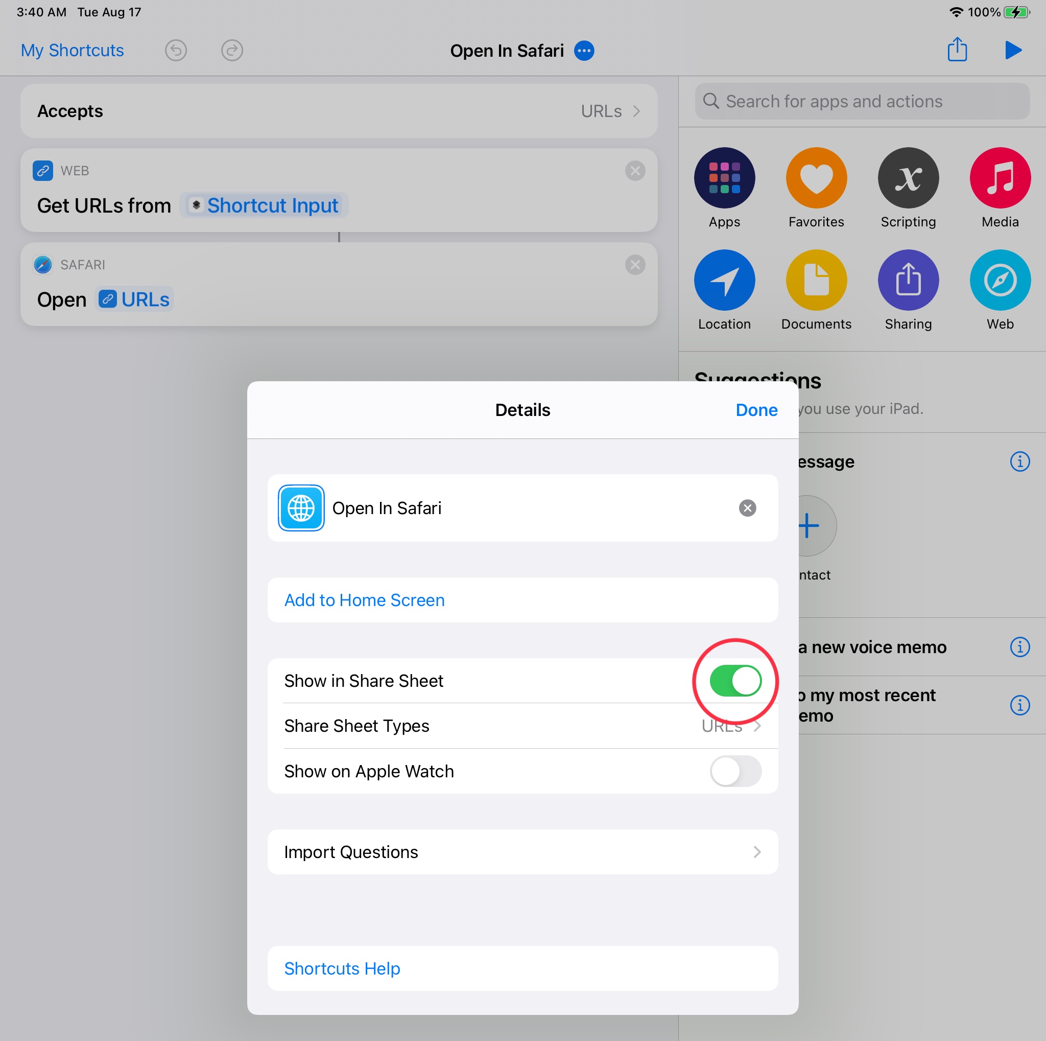 Make sure Show in Share Sheet is switched on.
