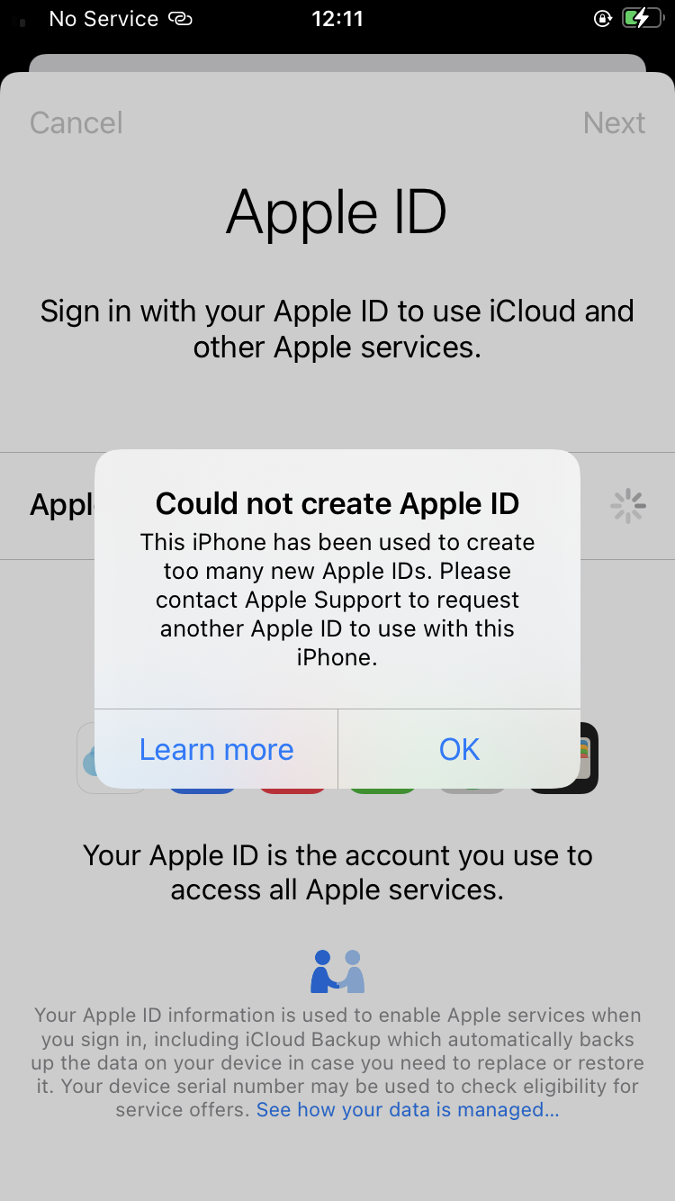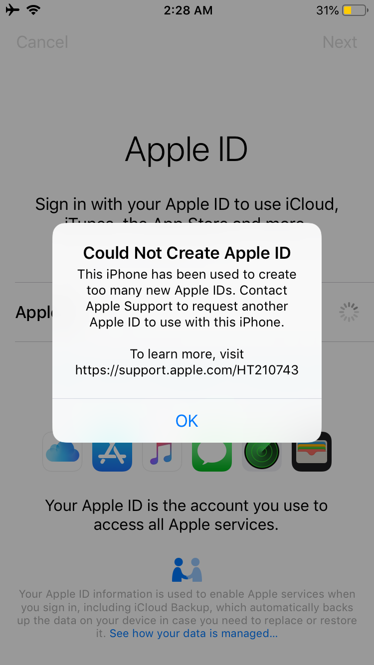 Apple ID - Could Not Create or Could Not Set Up iCloud message. *