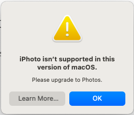 My current OS is BigSur 11.5.2. The error message is "iPhoto isn't supported on this version of macOS. Please upgrade to Photos". I've attached a screenshot of the message.
