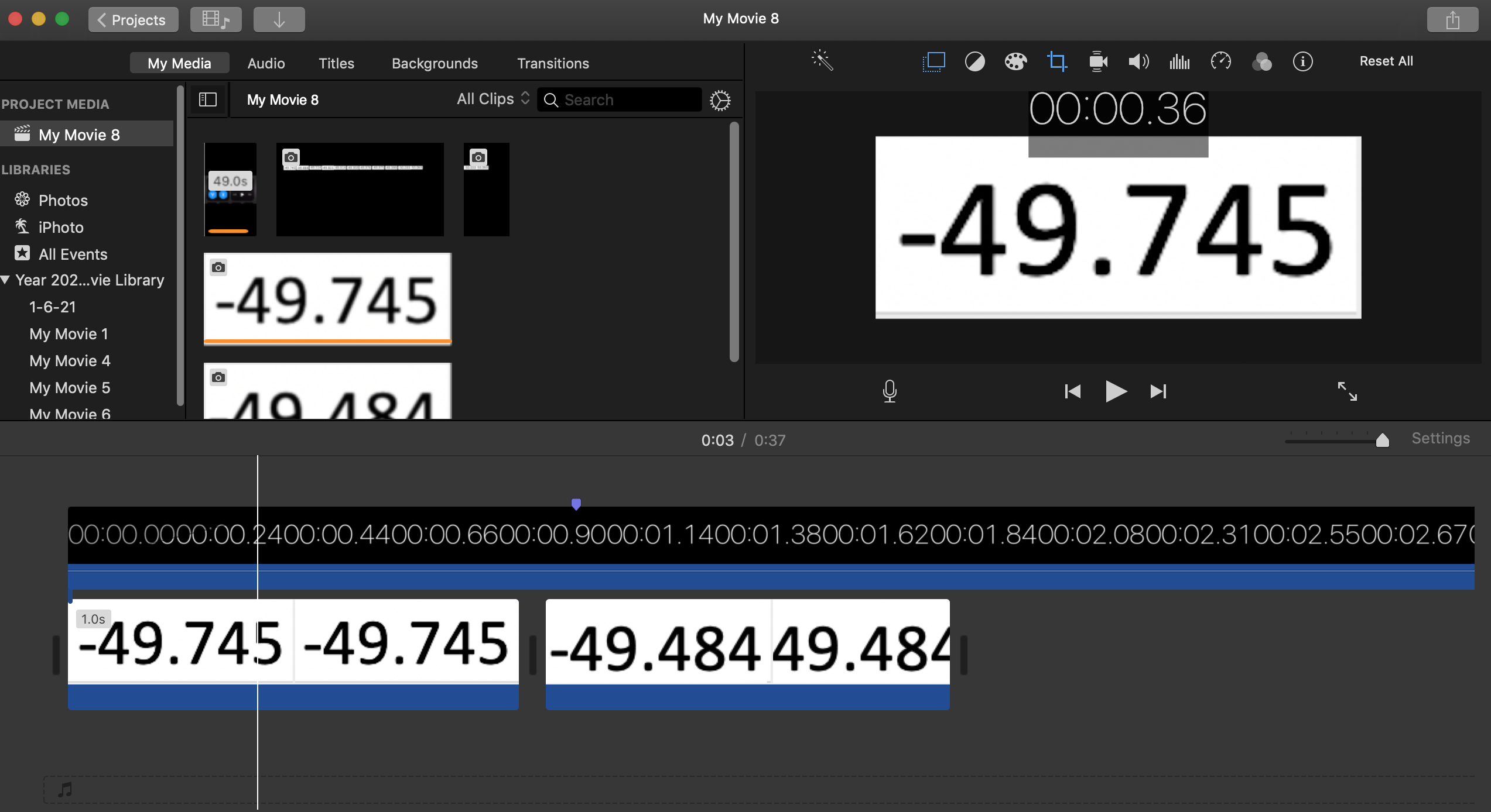Then make a timer video clip. To do that go to your iPhone and go to Clock/Stopwatch. Start the screen recording feature and then start the stopwatch. Let run for 11 seconds and then stop the recording. You will then have a screen recording video of the timer running in your iPhone Photos app. Use AirDrop to transfer it to your Mac. You will need to crop it to display just the timer, like this: