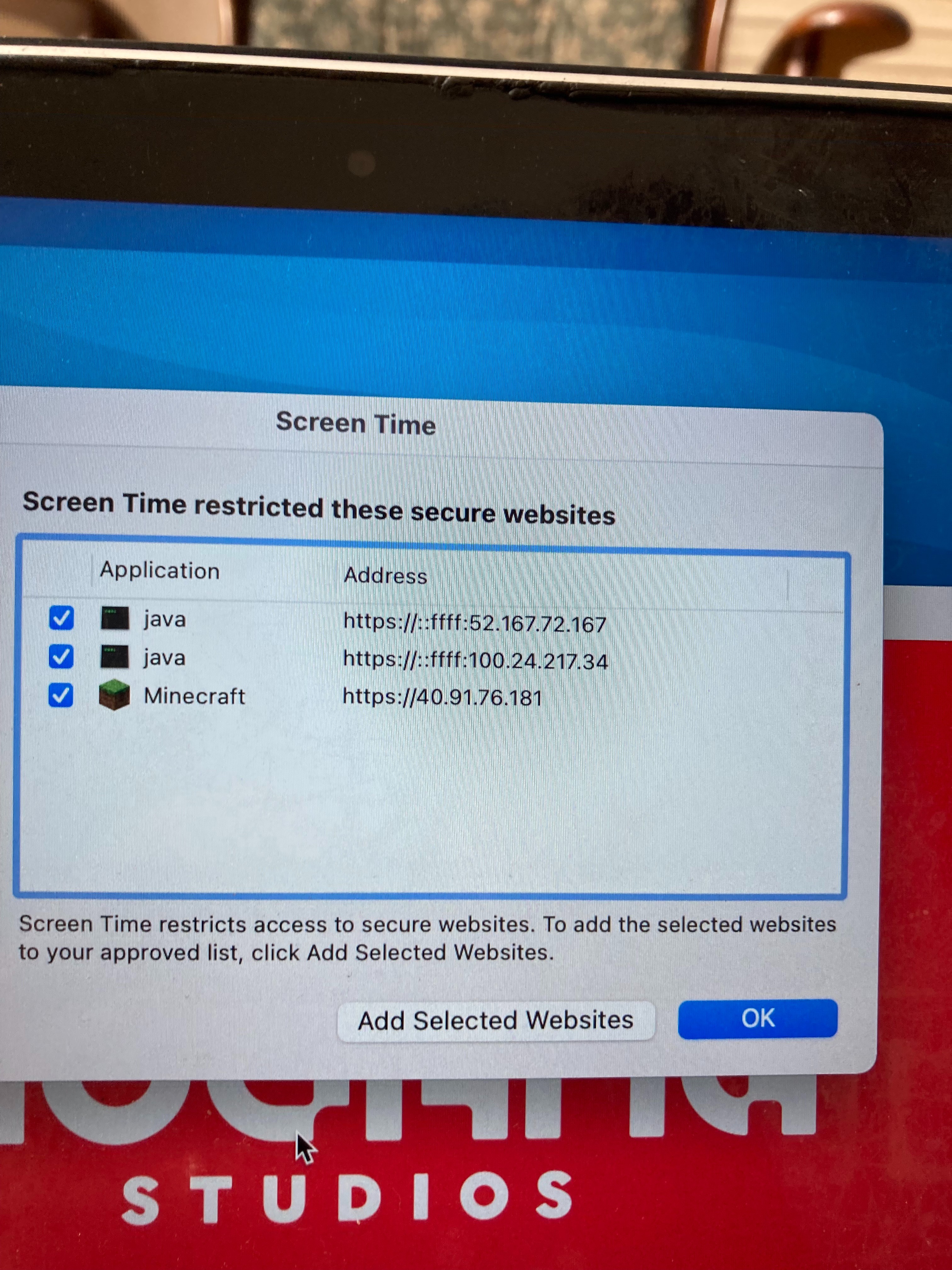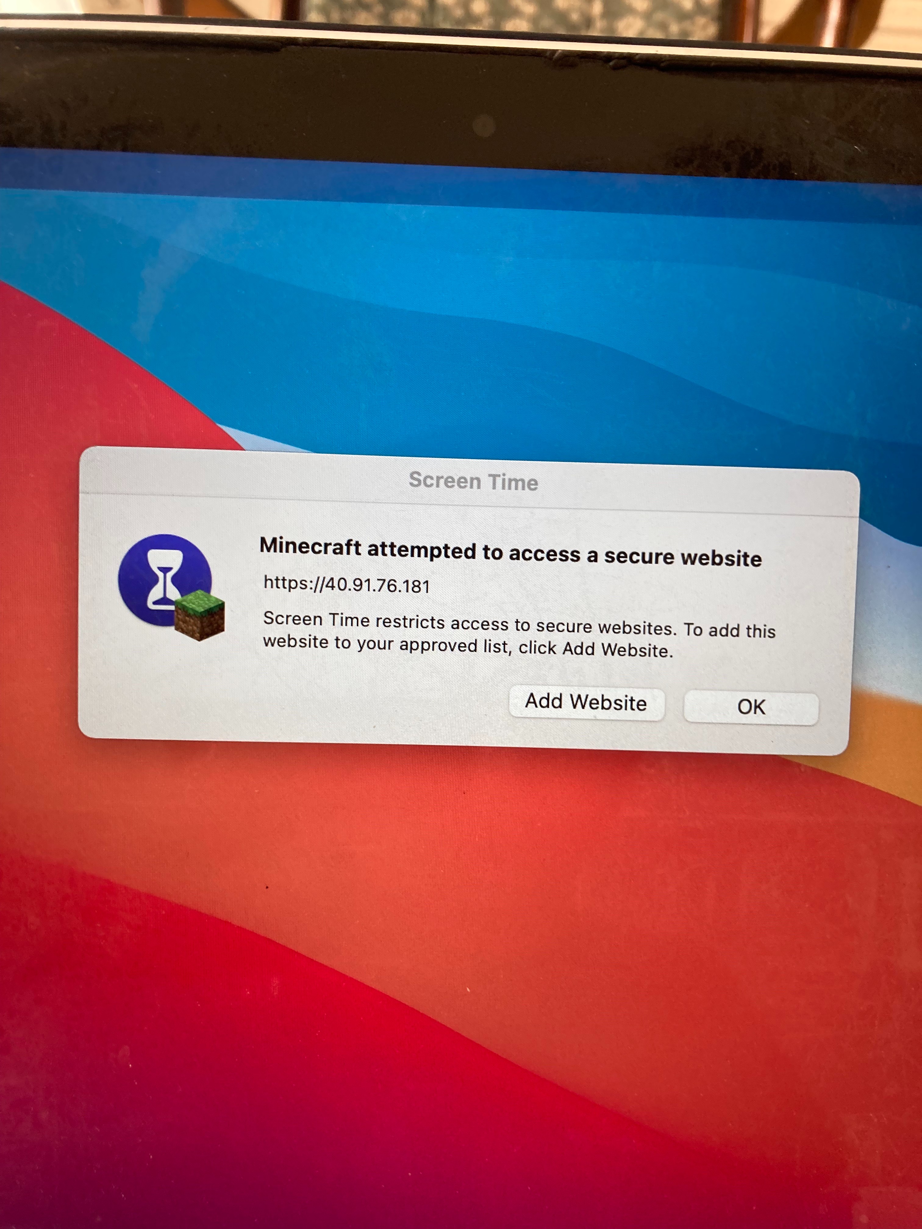 I set up screen time for my son who want to play Minecraft. But screen time restriction asks him to add website/JAVA all the time. Even I add selected website/JAVA, I have to do it again after restarting Mac. I called Apple customer service in Japan, but he couldn't help him out. Do I have to add selected websites/JAVA all the time when my son want to play Minecraft?
