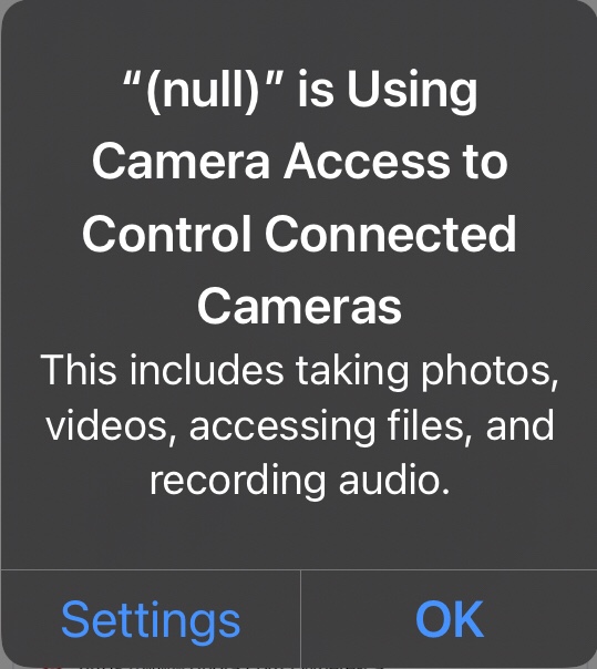 Earlier, i was using safari and I got this pop up saying “(null) is using camera access to control connected cameras. This includes taking photos, videos, accessing files and recording audio.” I closed the camera access on all apps but i still don’t know why this popped up, i don’t know if null referred to an application or a person trying to hack me. I’m really strict about my privacy so please give me further details if you know what this is.