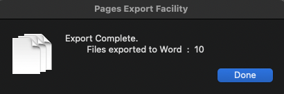 I suggest you do them in isolated batches of 250 and output that quantum to your designated folder. That is an arbitrary number, but AppleScript must open each Pages document before it exports it to Word, and 1000+ would run longer than daylight. If you are doing this on a laptop, keep it connected to the charger. When the script ends, it will present a dialog with the total number of files exported to Word.