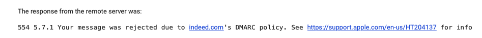 Apple is the one blocking Indeed.com emails, and it appears there is nothing to be done about it. It's a DMARC error associated with the sender.