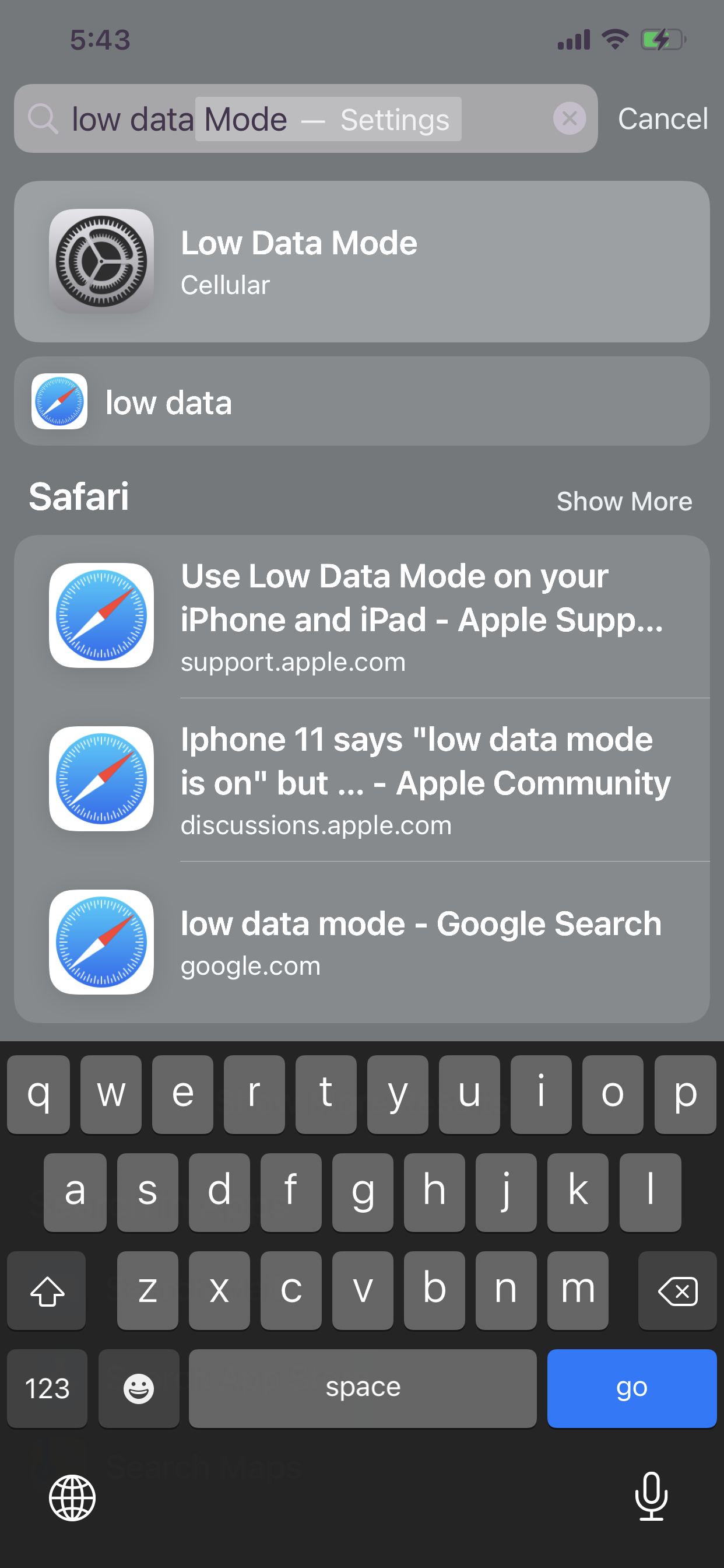 That is correct. Low Data Mode can be found directly in Settings ➔ Cellular ➔ Cellular Data Options ➔ Data Mode : Select Low Data Mode. This is available in search because this option is always there for Search to find.