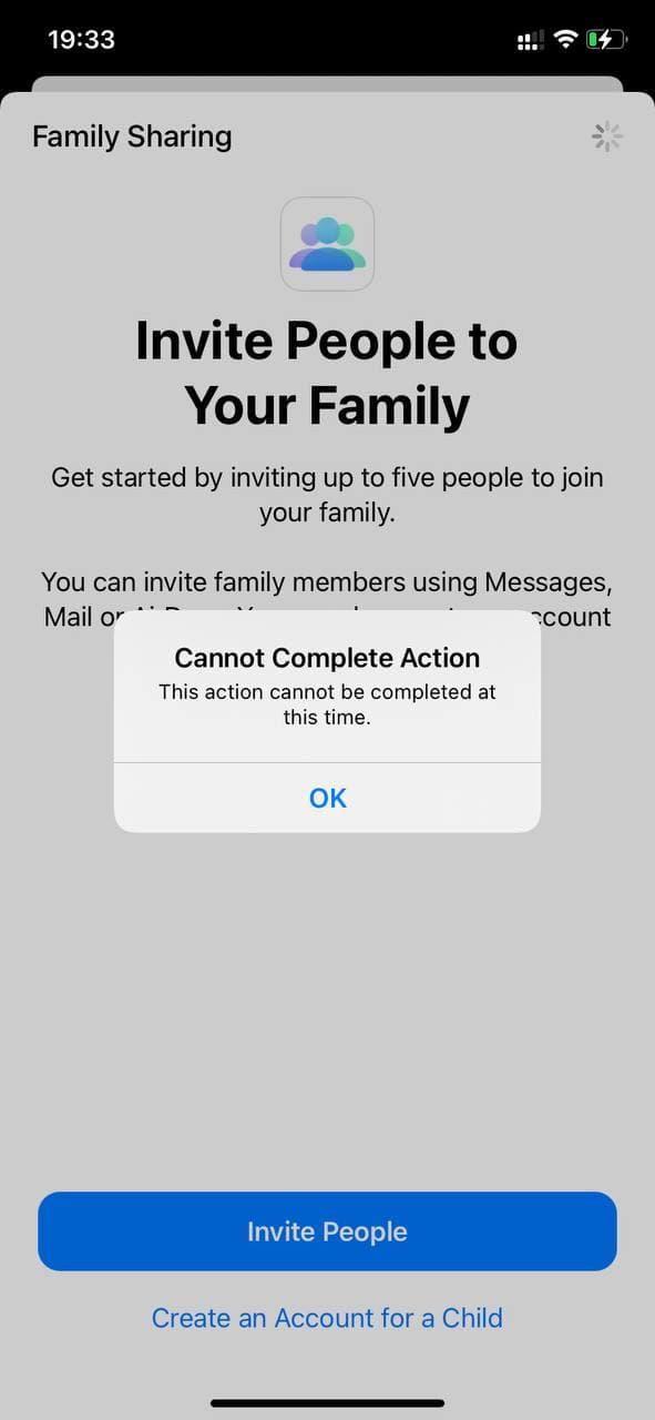 when I try to set up my family sharing, there is a notice, that "cannot complete action. This action cannot be completed at this time".
