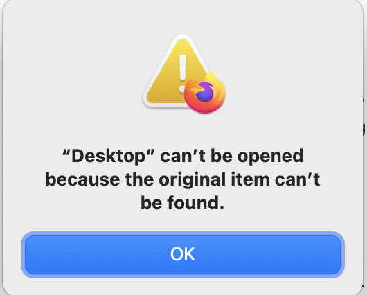 My wife's new M1 MacBook Air (MacOS 11.5.2) is suddenly having an issue finding files on the desktop. From Safari or Firefox if she tries to attach a photo stored on the desktop the message comes up that "Desktop can't be opened because the original can't be found". This started recently but no changes have been made. I did do a fresh install of Big Sur but it didn't help. What will fix this?
