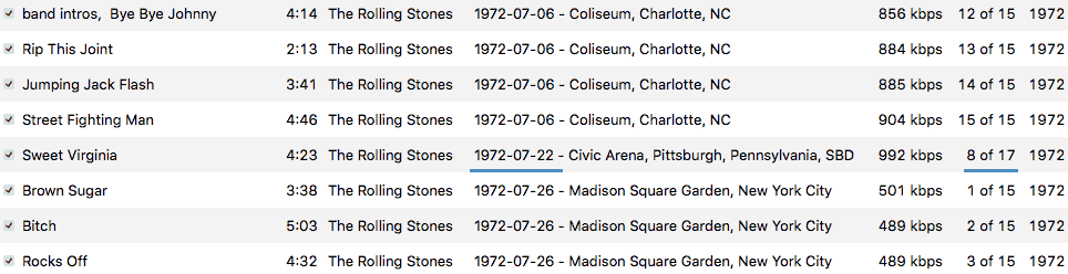 A good example is a Rolling Stones album called 1972-07-22 - Civic Arena, Pittsburgh, Pennsylvania, SBD where the album appears at the end of The Rolling Stones album listings & after the songs with no album information. Yet one of the songs does appear in the correct position.
