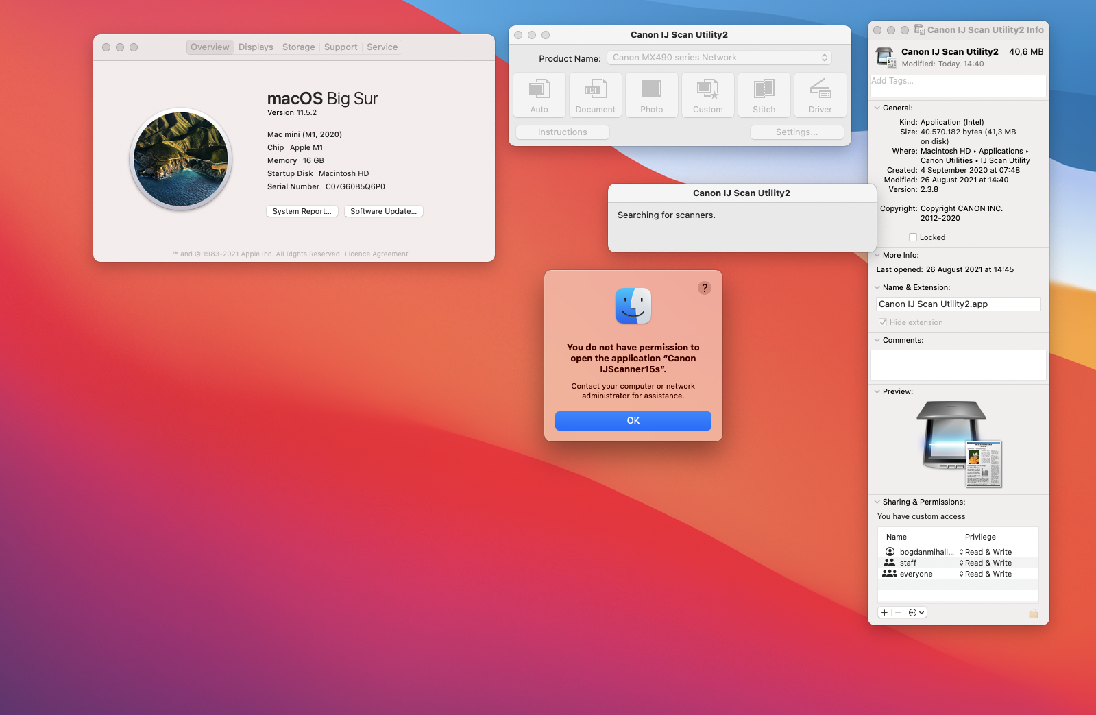 Hello everyone! I am having an issue with the "Canon IJ Scan Utility2" scanning application. Every time I open it, it says "You do not have permission to open the application CanonIJScanner15s".