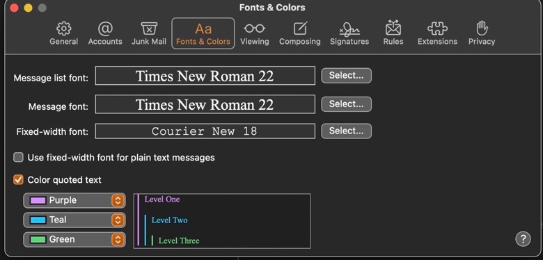 Some Apple devotees I know are annoyed by any font that isn’t Arial or Helvetica. These are not people that worked for Apple, just people that have met Steve Jobs and worship him to some extent. This also speaks to the ironic nature of not being able to by default view a message in plain text. I guess they also want to identify the non-conformists by their fancy (like Comic Sans) fonts. 😂 As far as Apple employees, many might think that their outgoing font is the message font. Really, the only reason I want the Apple Mail Client to do this, is, I don’t want to use a buggy 3rd party app. Which I do.