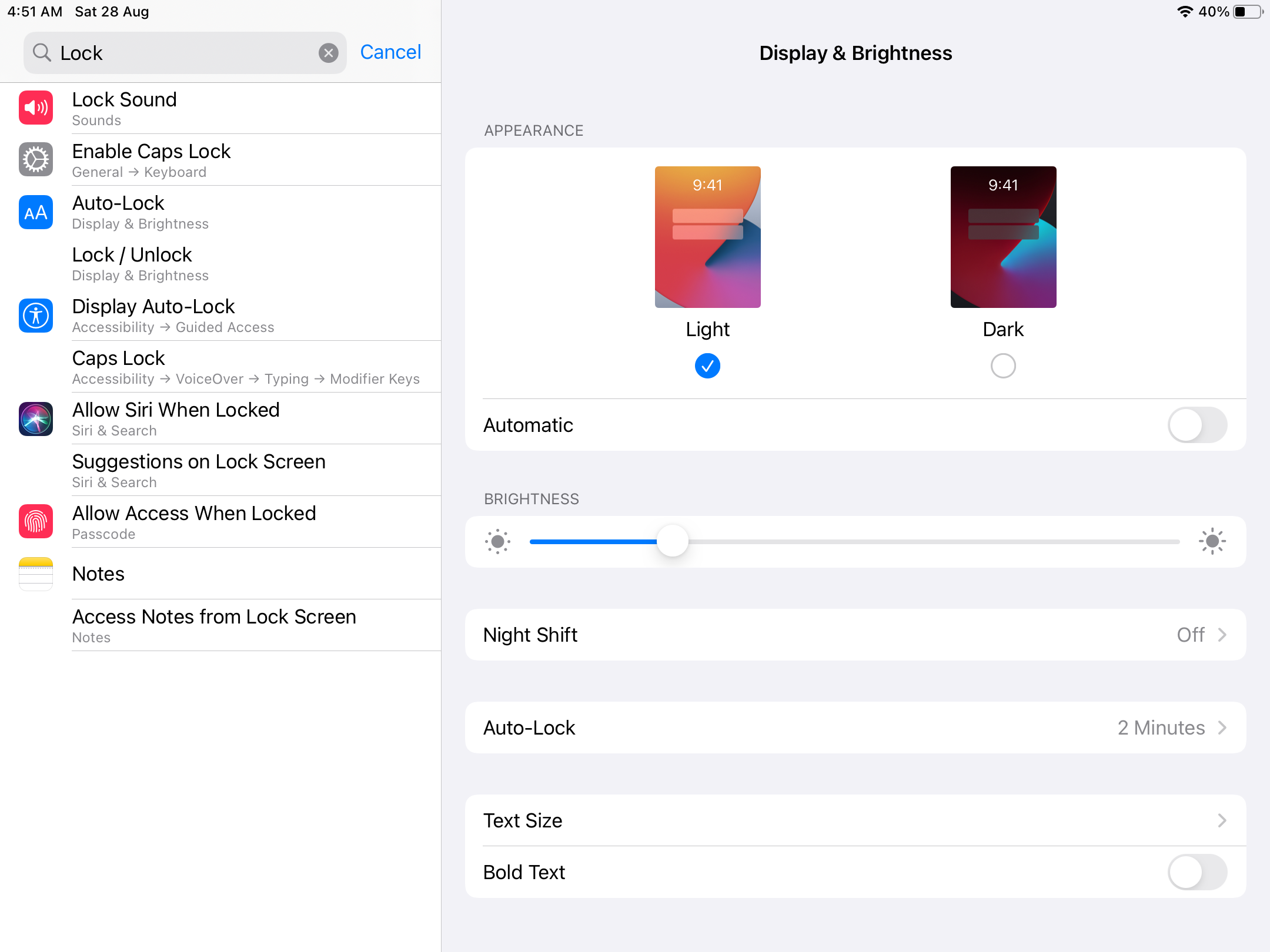 I see that the Lock/Unlock options shows up in your search results however is not present when you try and find it under Display & Brightness. There is a reason for that and that is, It won’t appear in iPad settings unless a compatible folio or cover is used with the iPad first.