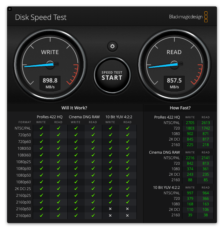 I am using a Belkin Thunderbolt 3 USB-C Cable and Blackmagic Disk Speed Test to test the speed of a new Sandisk Extreme Pro Portable SSD v2 with a Mac Mini M1. The max read/write speed I am getting is approximately 900MB/s. It's APFS formatted.