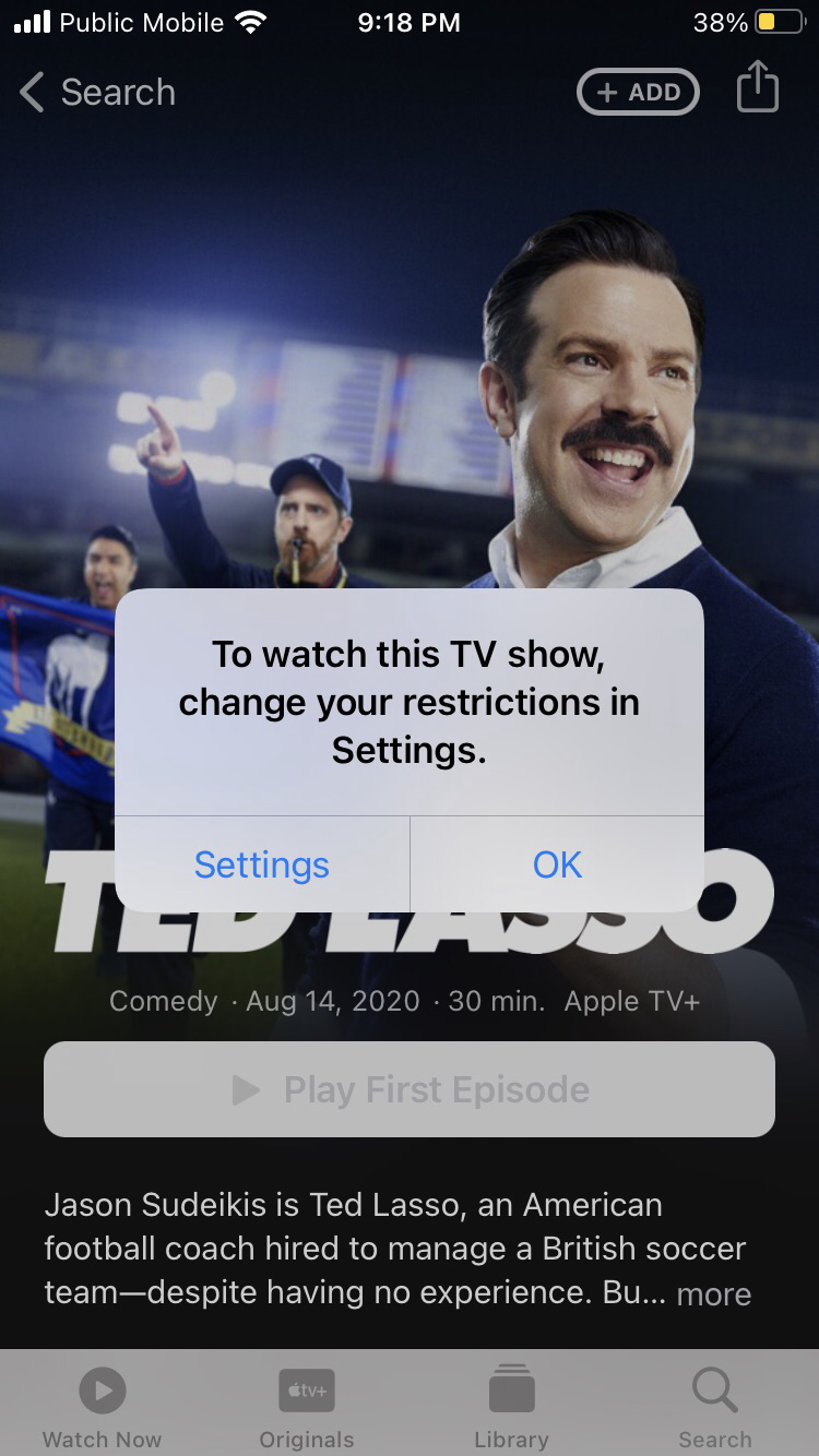 I have bought a subscription to Apple TV and I’m trying to watch Ted Lasso. When I press play it says I need to change my restrictions in settings….. I tried ever and it still won’t play, it also won’t play the dads documentary for the same reason.