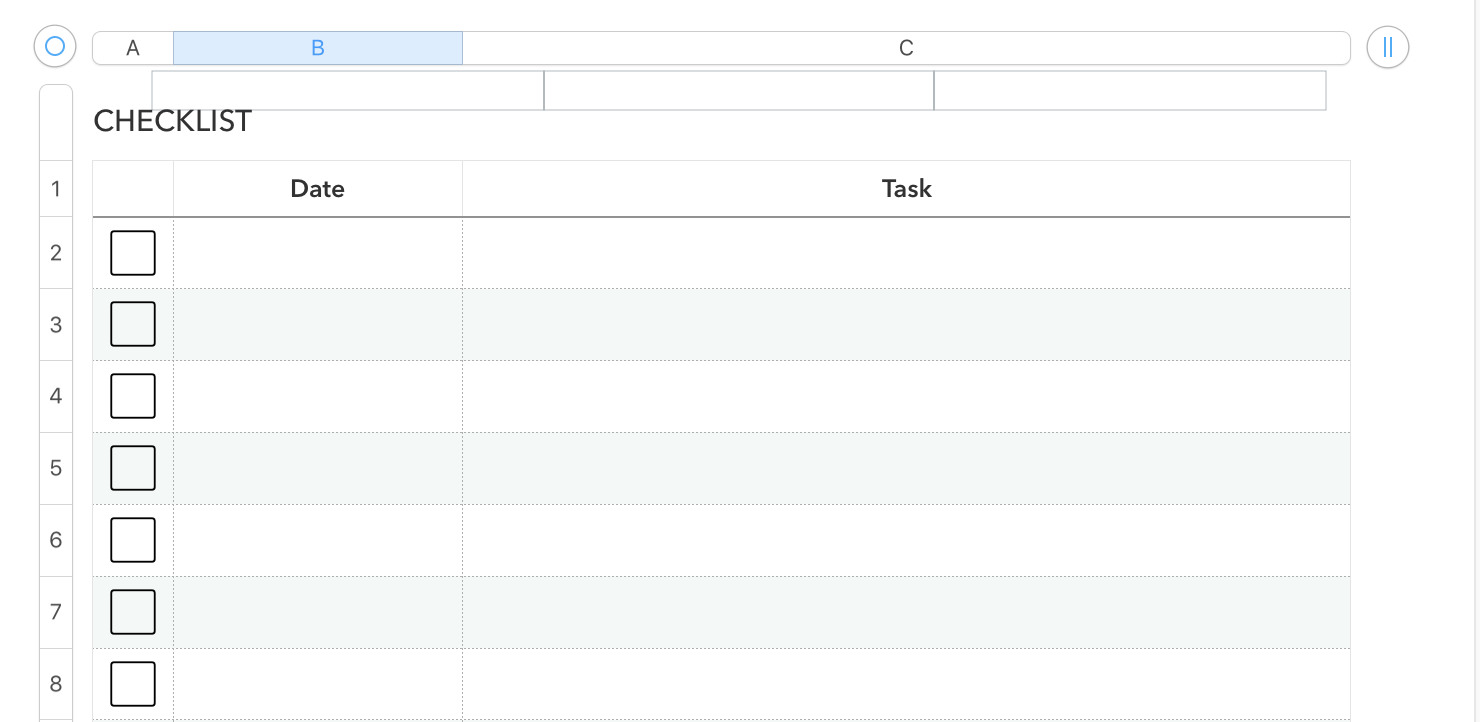 This shows the first few rows of the tChecklist table made from the Numbers template, then copied and pasted into Pages, followed by replacing the FALSE entry in the first cell of each row with the 'white square with rounded corners character, increasing its text size to 20 pts, and filling it in to all cells in the body rows of column A