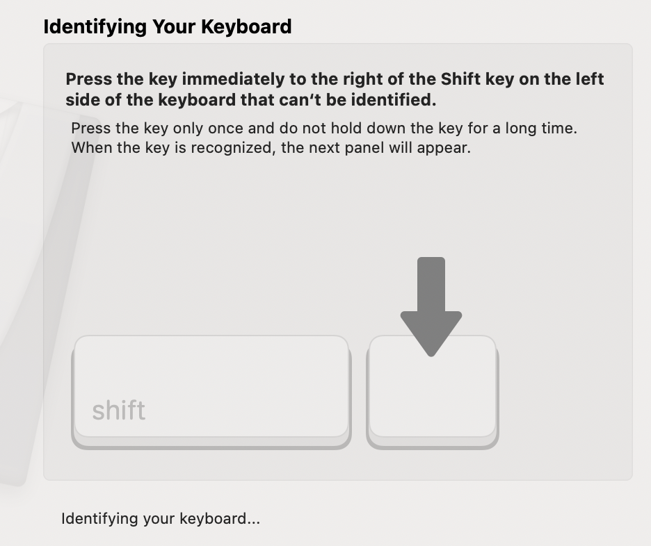 I bought a Miniso keyboard recently and have been trying to connect it to my Macbook Air 2020. However, when the prompt "Press the key immediately to the right of the Shift key on the left side" comes up and I press the key Z, it stays stuck on the panel below:
