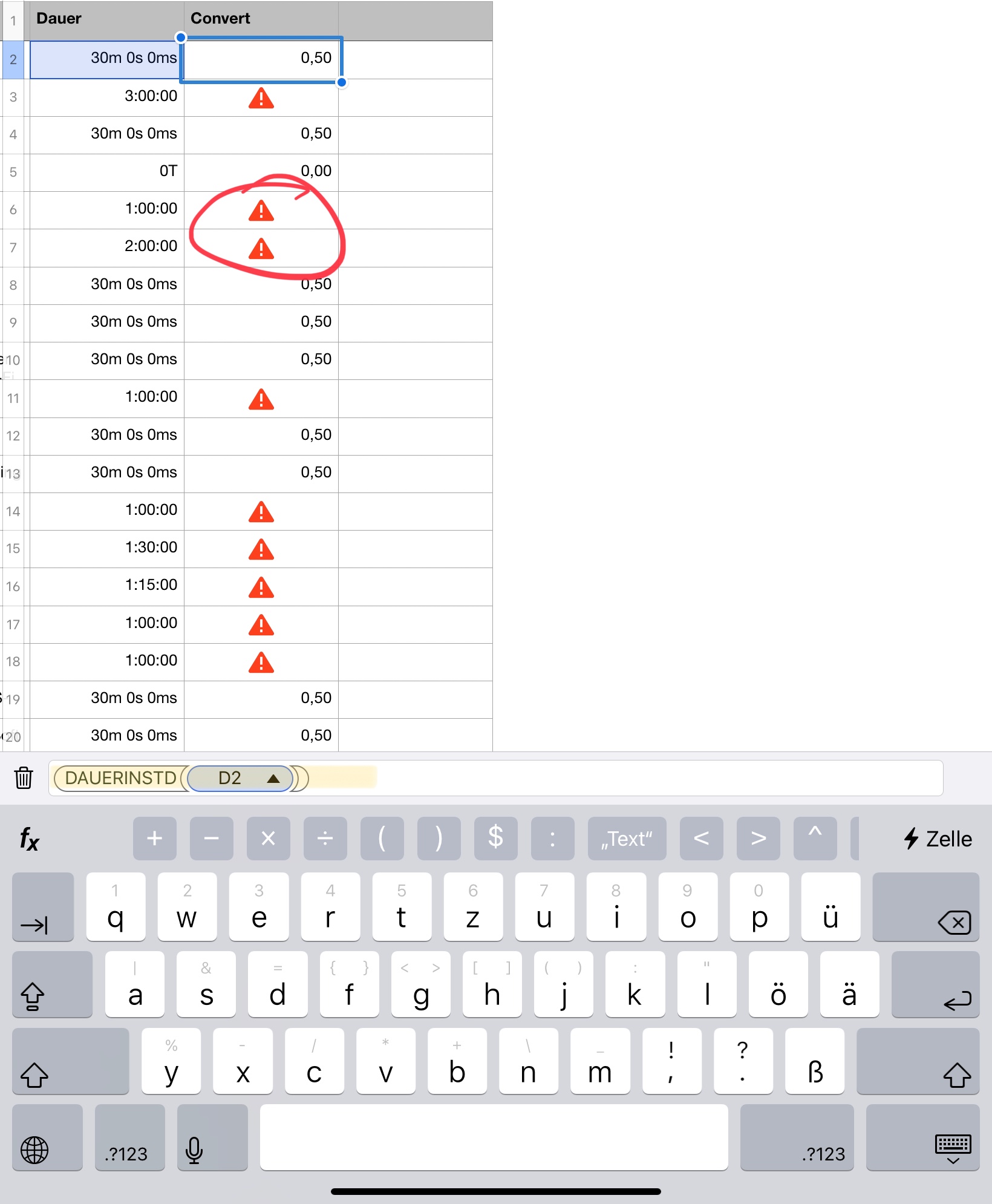 The cells in column A next to the errors in column B have times of day in them, not durations. The others are durations only because there is no 30th hour in a day so Numbers interpreted those ones as durations instead. When you type something like 1:15 into a cell, Numbers first assumes it is a time of day. If it cannot be a time of day, it will assume it is a duration. If you pre-format the cells as a duration (before typing anything into them), Numbers will know what it is supposed to be and won't mess it up. However, it is recommended with durations that you enter them in the format 1m15s not 1:15 so there is no ambiguity in what you mean.