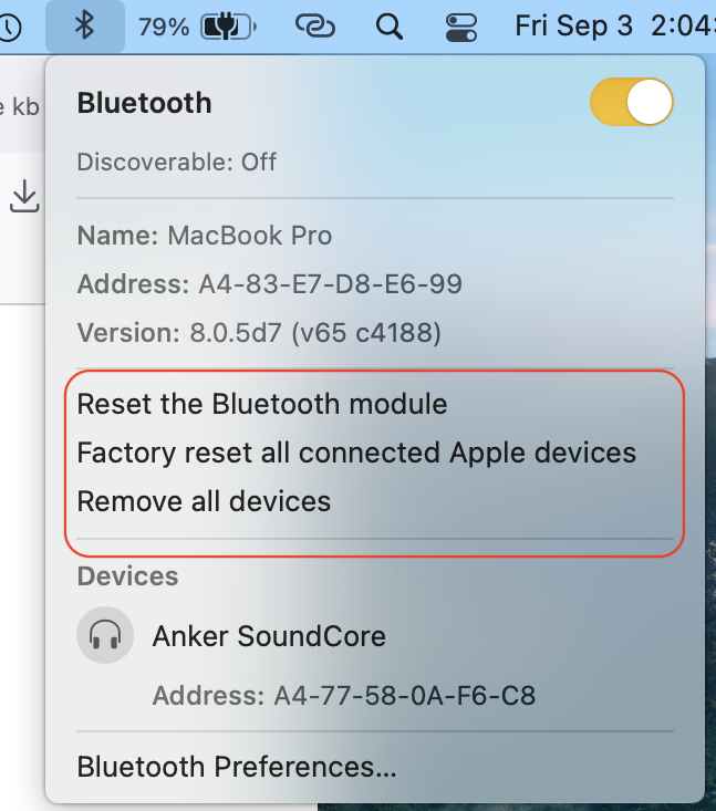 You can hold the Shift Option key and click open the BT icon in the upper right menubar> Reset