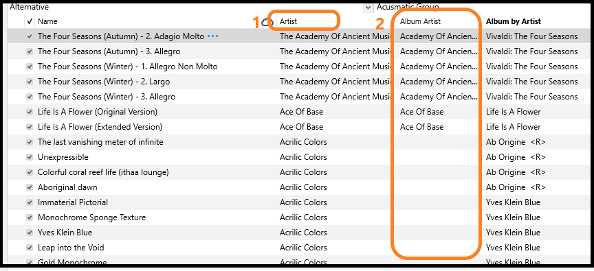 -Artist: Used to List Main Artist(s)/Group for an individual Song. I don't really use this for sorting but rather as an informational tool.