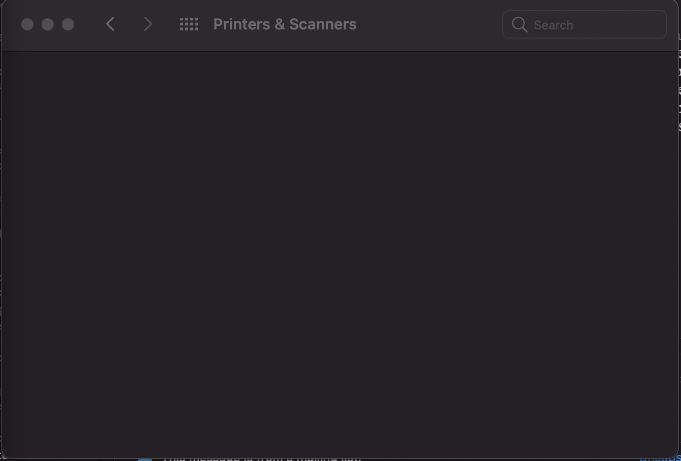When I go to System Preferences > Printers & Scanners, the page shows for an instant, and then disappears, and I'm left with a dark gray window that looks like this: