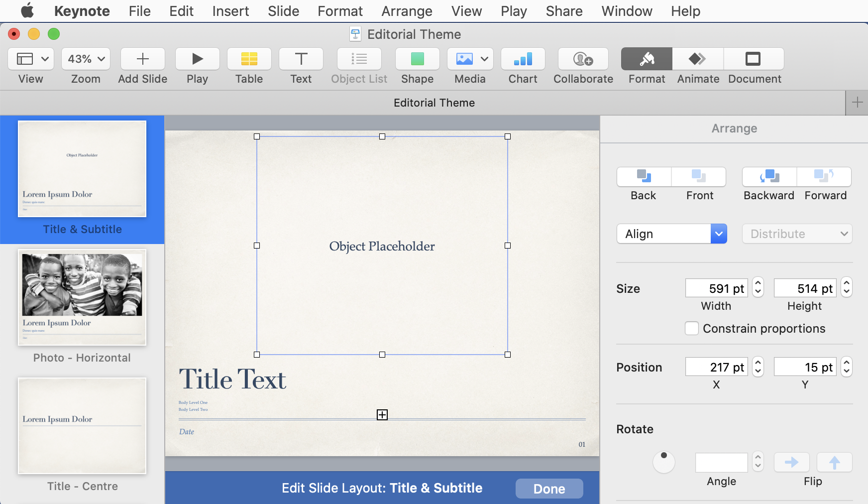 Have a look at the Editorial theme using the Title and Subtitle Slide Layout as shown below.