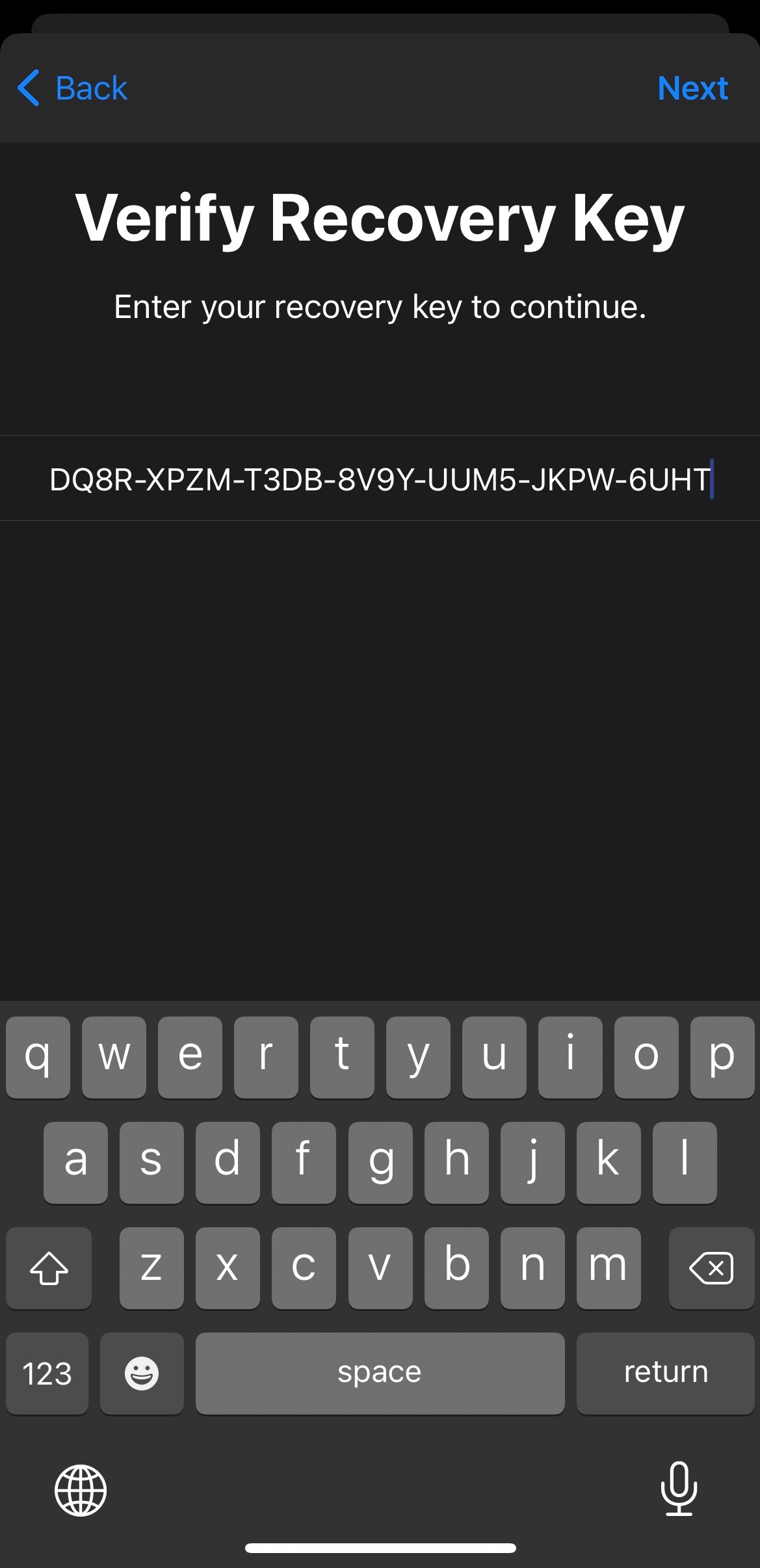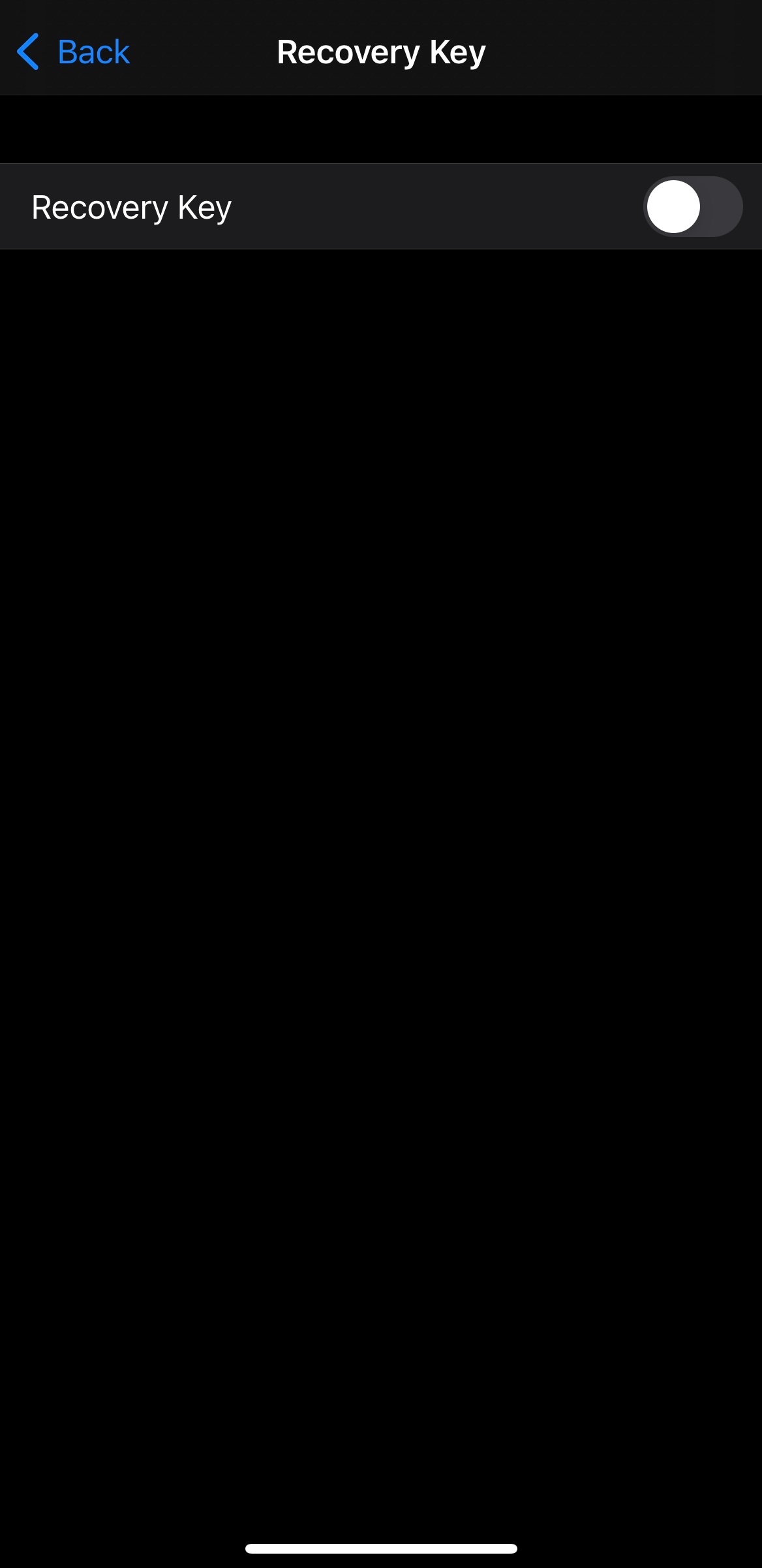 Settings > [my name] > Password & Security > tap Turn On Recovery Key > a key is offered > then it is asked to confirm by entering the proposed key > after input - error.