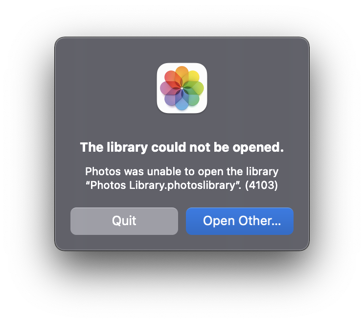 Photos was unable to open the library “Photos Library.photoslibrary”. (4103)"