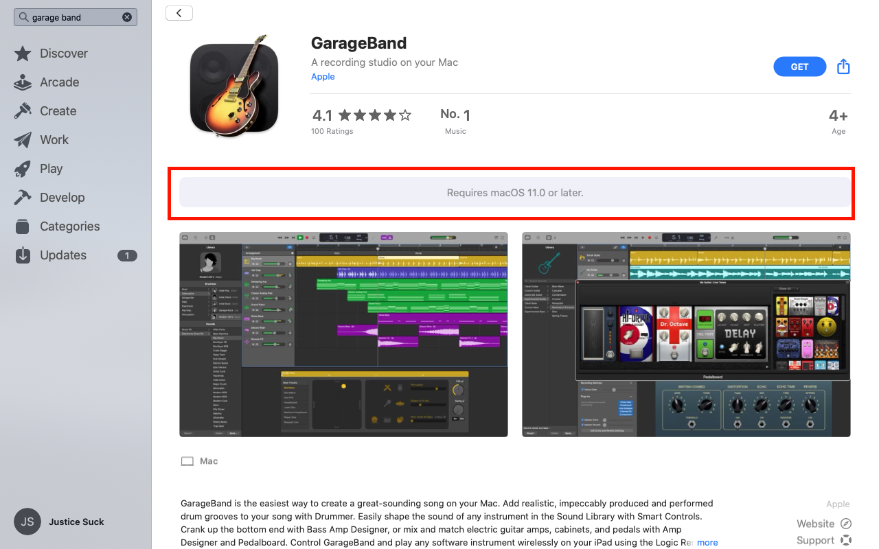 The current version of GarageBand, version 10.4.3 has been written for macOS 11 Big Sur and can only run on the newer system, but you can work on Catalina with the previous version, that has been released for Catalina.