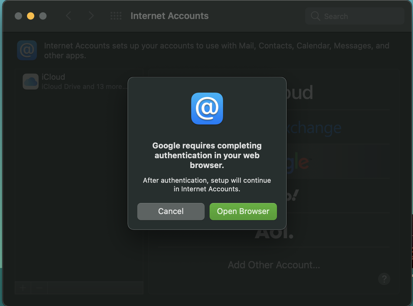 I go into System Preferences>Accounts and select Google. I am then told that another browser window will open.