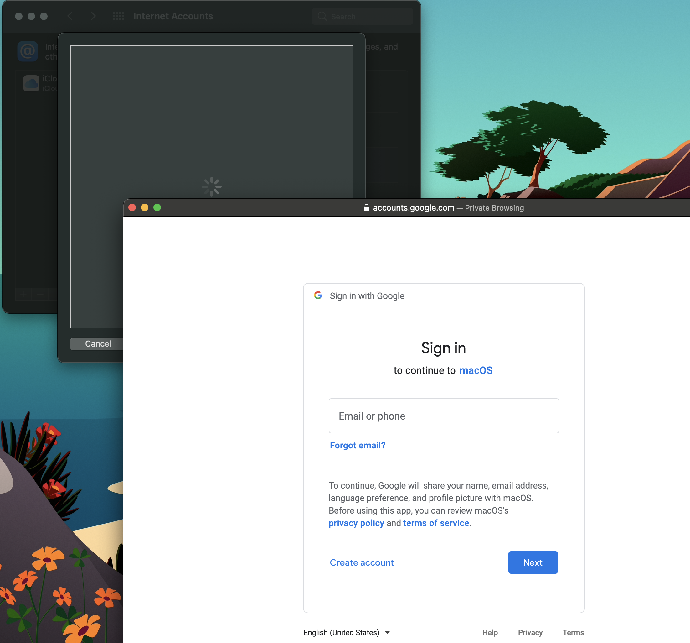 I go into System Preferences>Accounts and select Google. I am then told that another browser window will open.