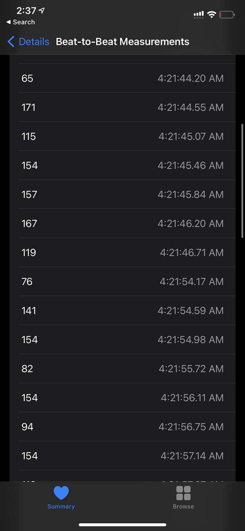 i found these measurements not realistic , because my heart beats during day are fine also the measurements have odd spikes (like increase and decrease from 100 to 175 to 135 to 65 to 171 to 115 in less than seconds ) !