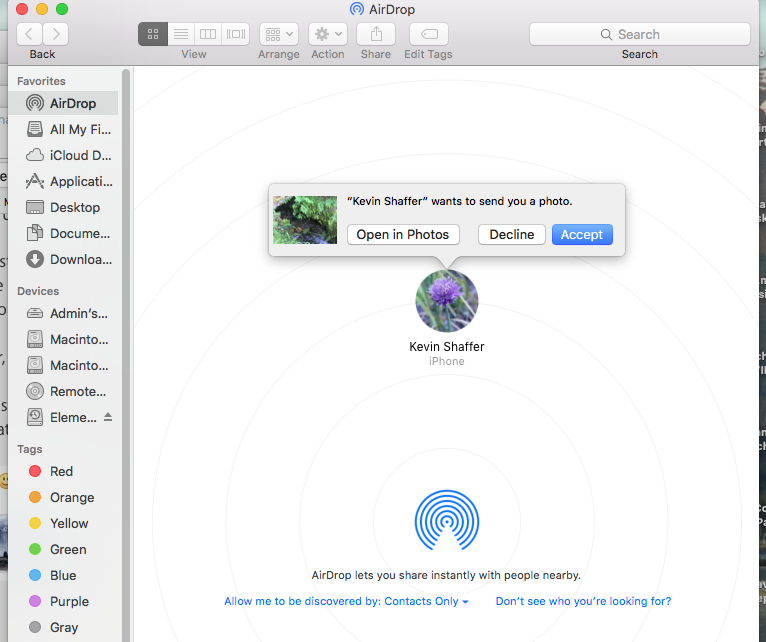 Turn on Mac's AirDrop from Go menu; to start iPhone (camera source) for image to arrive in Mac;