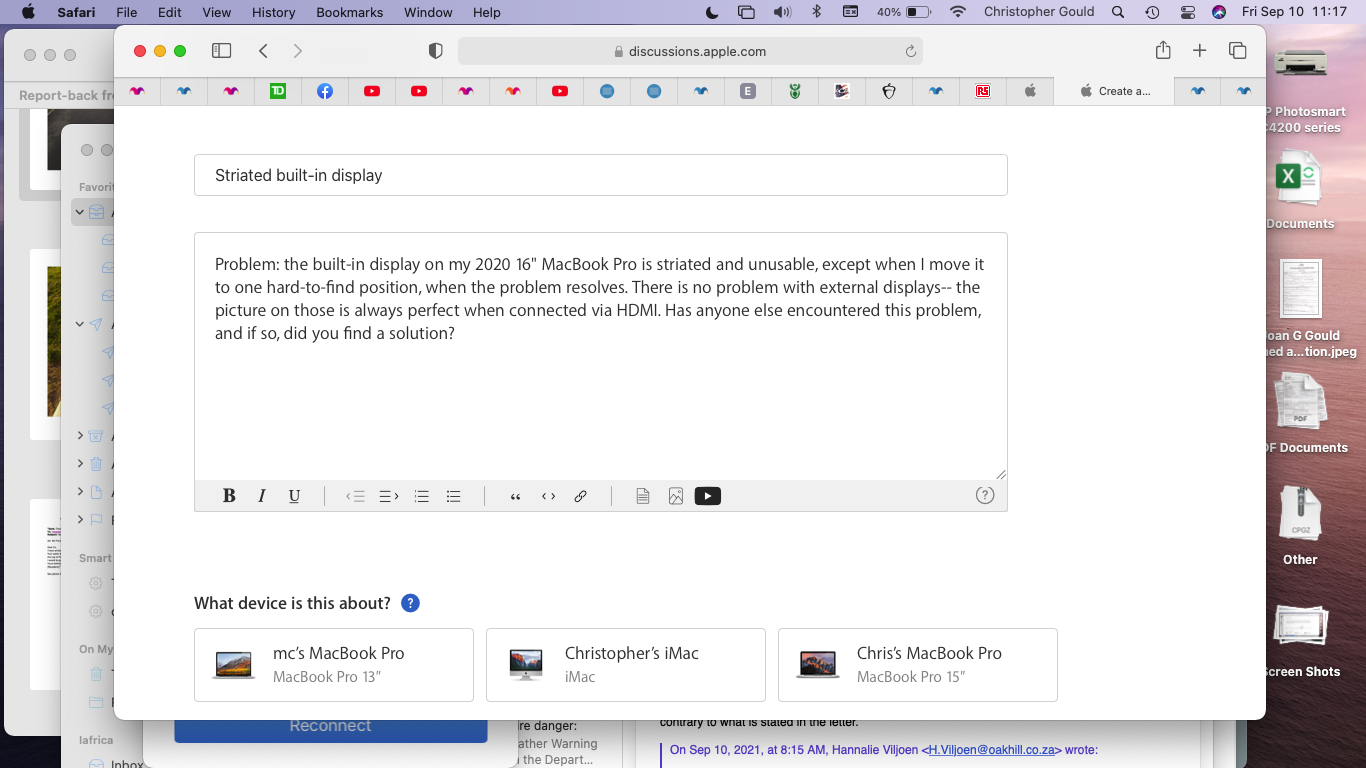 Problem: the built-in display on my 2020 16" MacBook Pro is striated and unusable, except when I move it to one hard-to-find position, when the problem resolves. There is no problem with external displays-- the picture on those is always perfect when connected via HDMI. Has anyone else encountered this problem, and if so, did you find a solution?