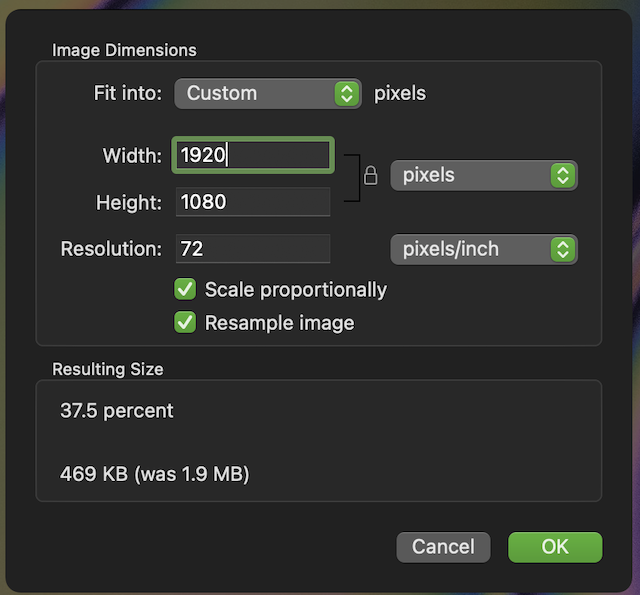 I've tried "Tools" then "Adjust Size" and now the file is getting larger! I've also tried "File" then "Export" and changing the size from there, it shows the new size, but doesn't save it. I've duplicated the file repeatedly, in hopes that the changes would save on one of the copies, but no luck there either.