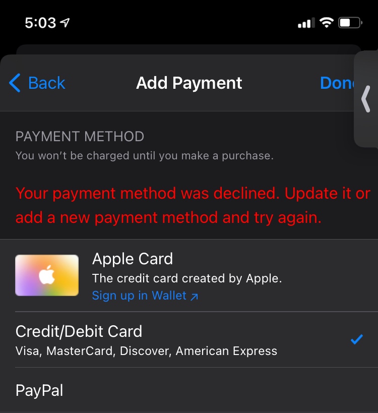 How do i update my payment information if it declines my debit card and a light green screen flashes when I try to update it?!…