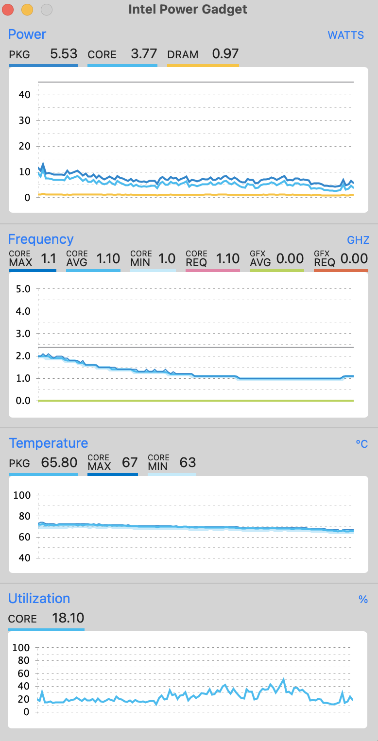 On the Intel Power Gadget, it shows 1.1 and the core utilization is about 20%.