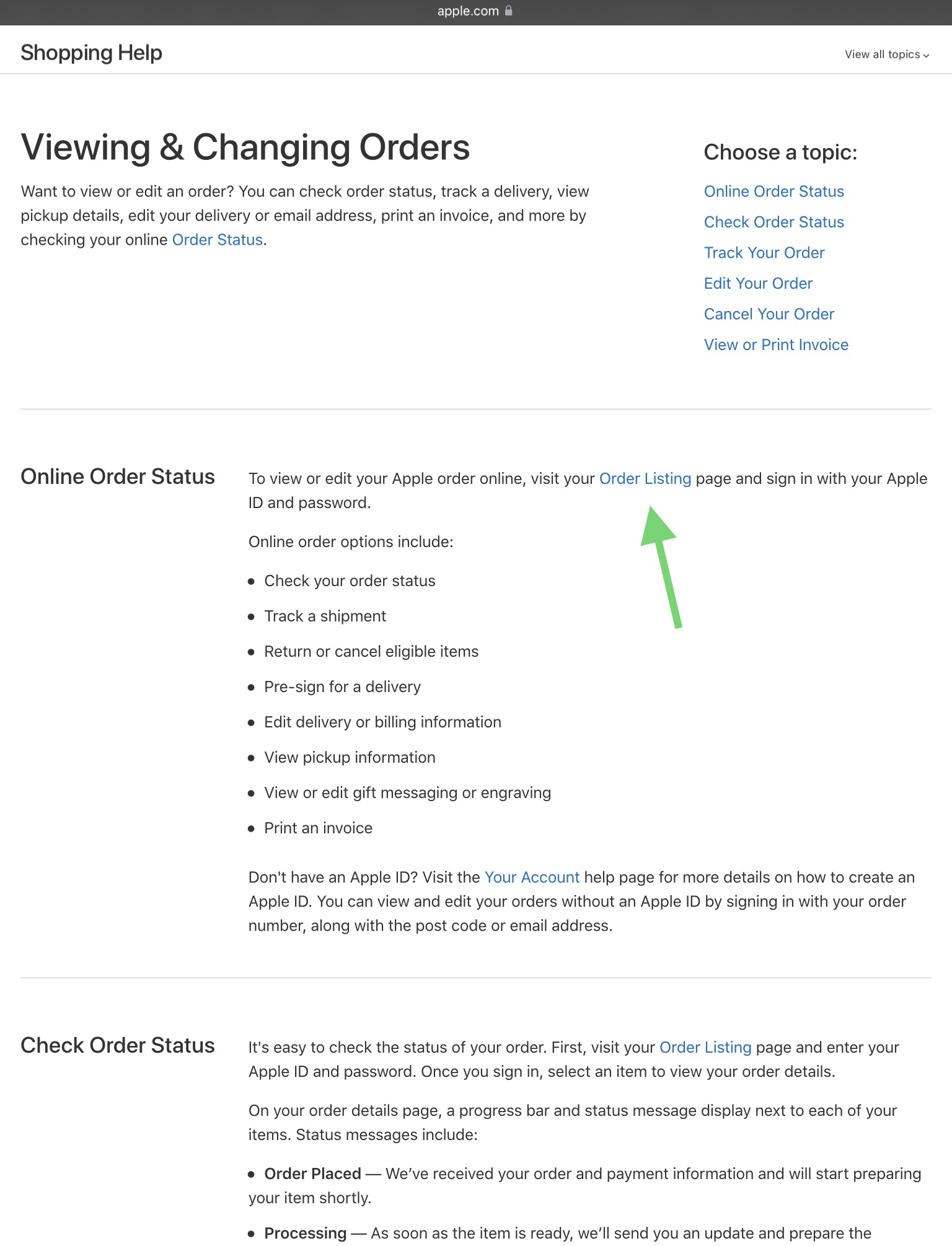 Try https://www.apple.com/shop/help/viewing_changing_orders and click on Order Listing.