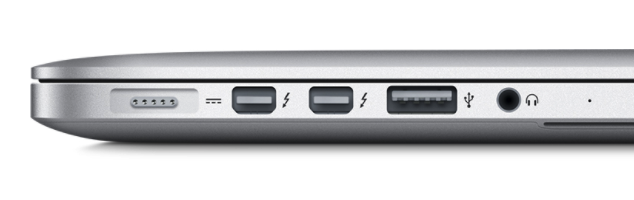 The USB port between the headphone and the thunderbolt 2 ports on this image can't be adapted to video easily.