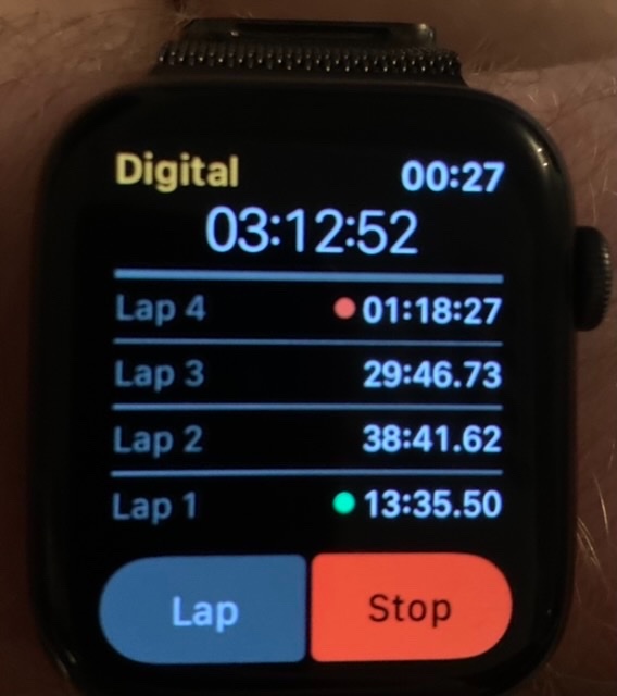 I may be being stupid here but what does the red symbol next to a time on the stopwatch app indicate? I can see theres a green one for the first lap i did so i’m guessing thats for the first lap recorded for the time but i have a red dot symbol on one of the times and i dont think its for when i stopped as i have laps recorded after that one. Any help?