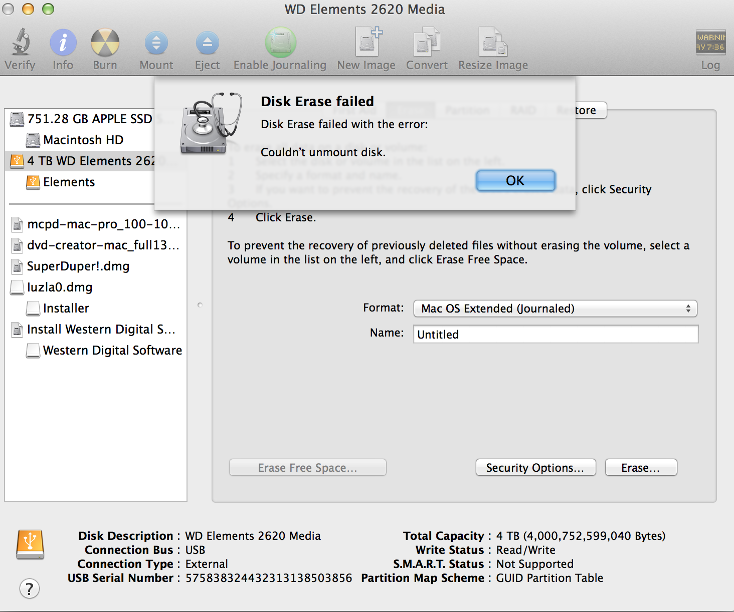 I have a brand new Western Digital 4T external hard drive. I am unable to format it to Mac OS Extended (Journaled) when I click Erase. Tried several times and received the error message below. I even tried EXFAT, thinking I could change it back to Mac OS Extended (Journaled). But that didn't work either, as I received the same error message.
