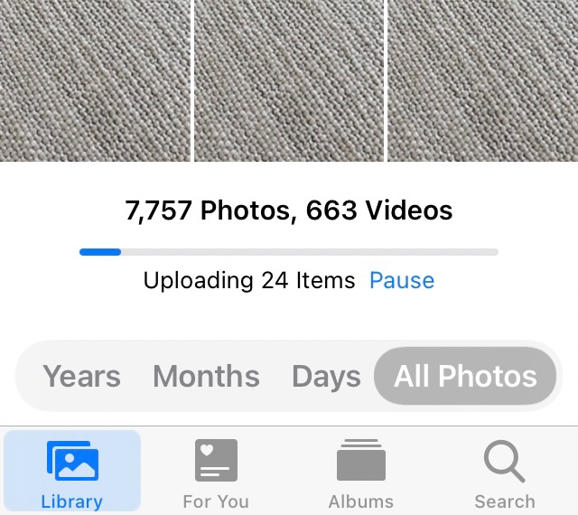 Message "Uploading 25 items" in black, then "Pause" in blue (clickable... asks if you want to pause until evening) appears at the bottom of my photo library on the iPhone.