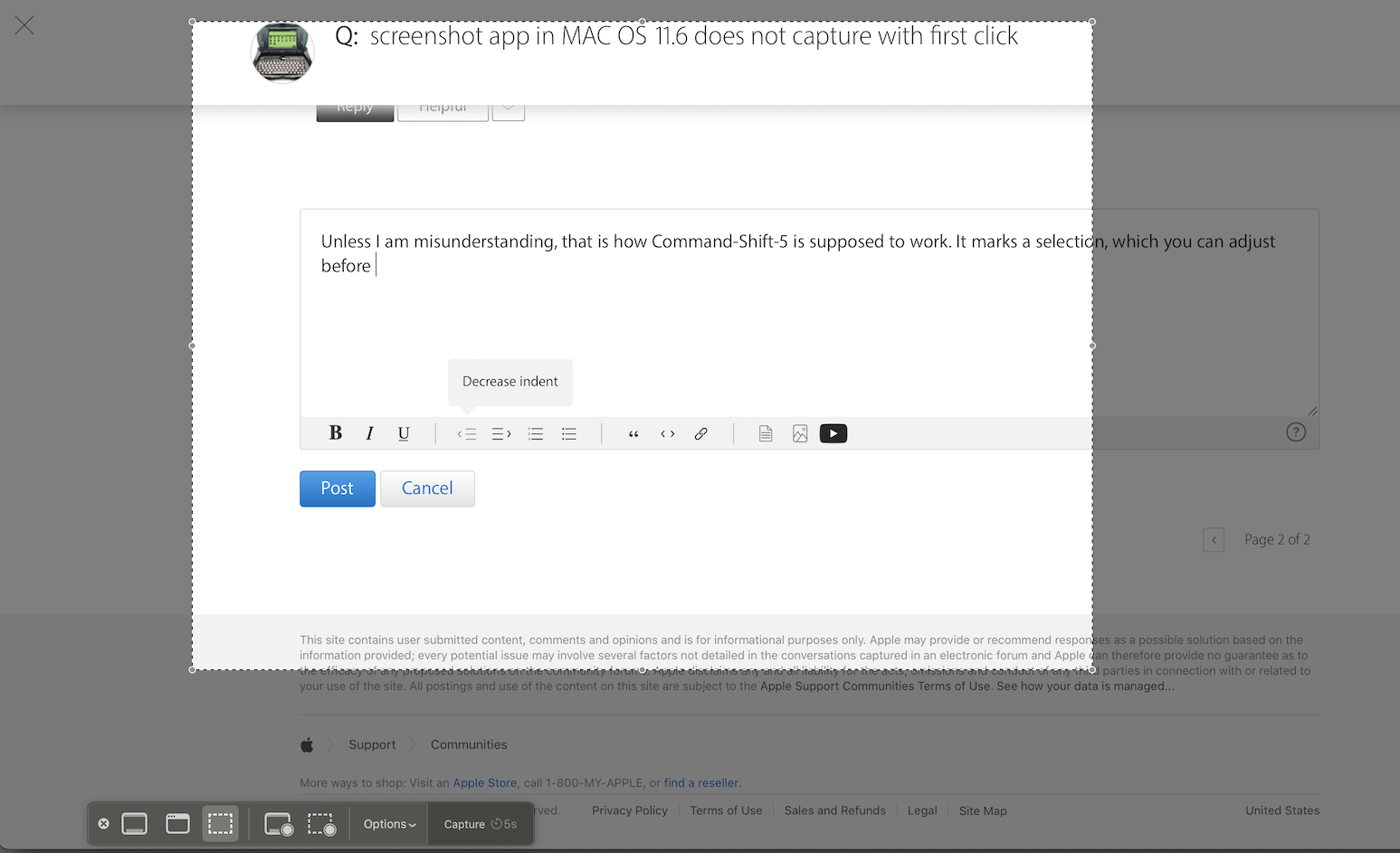 screenshot app in MAC OS 11.6 does not capture with first click