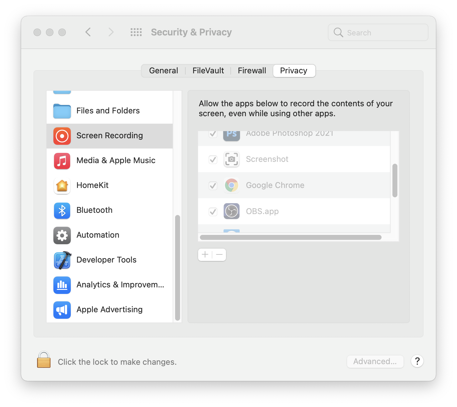 Also added QuickTimePlayer and tested that (New Screen Recording) was working (not) so added the app to the new privacy settings