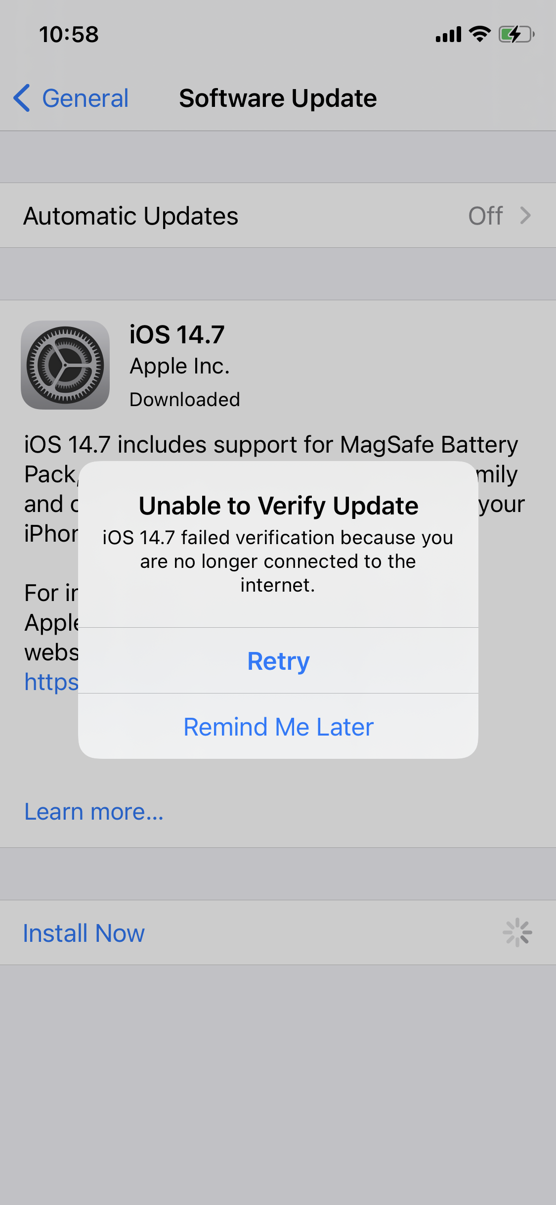 i am trying to update the IOS 14.7 but when I try to install it, it says that I am not connected to the internet. I am using both Wifi and Mobile data.
