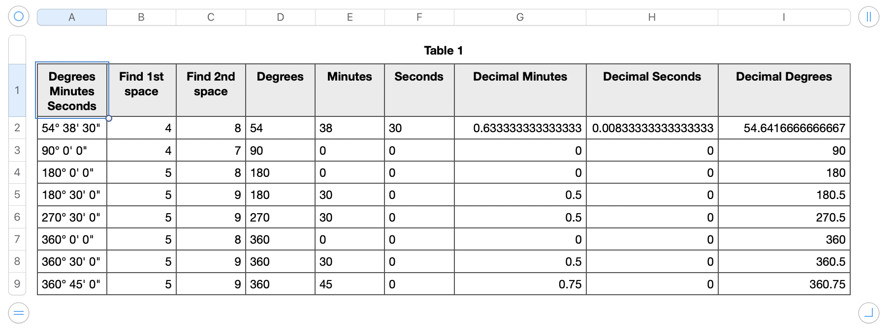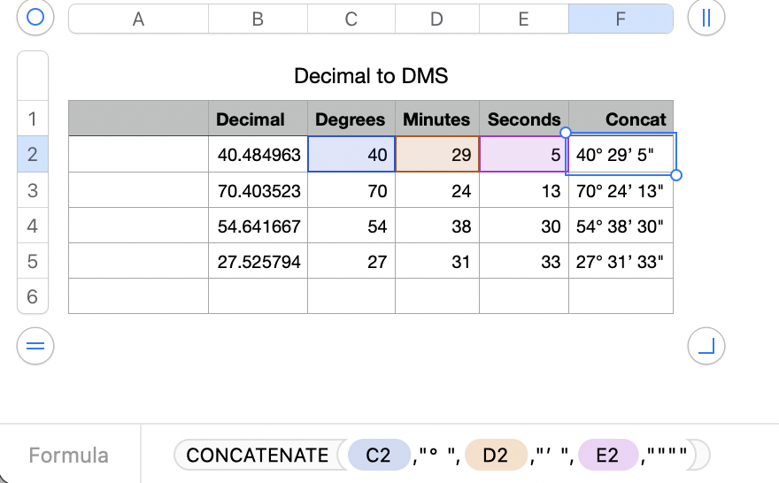 Convert degrees, minutes, seconds into decimal number and the opposite in Numbers